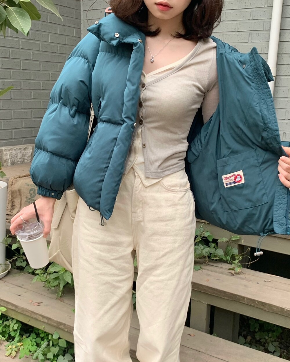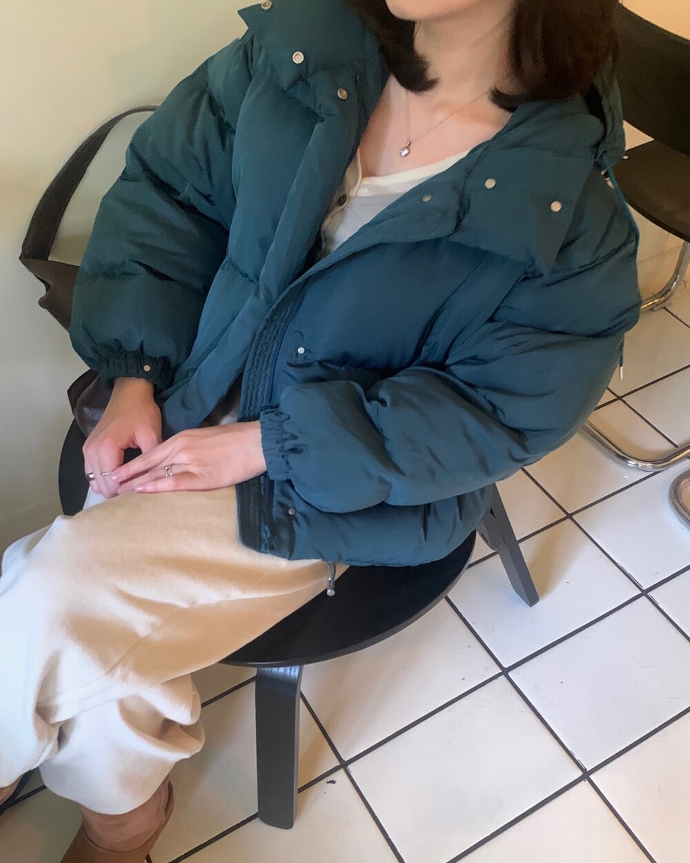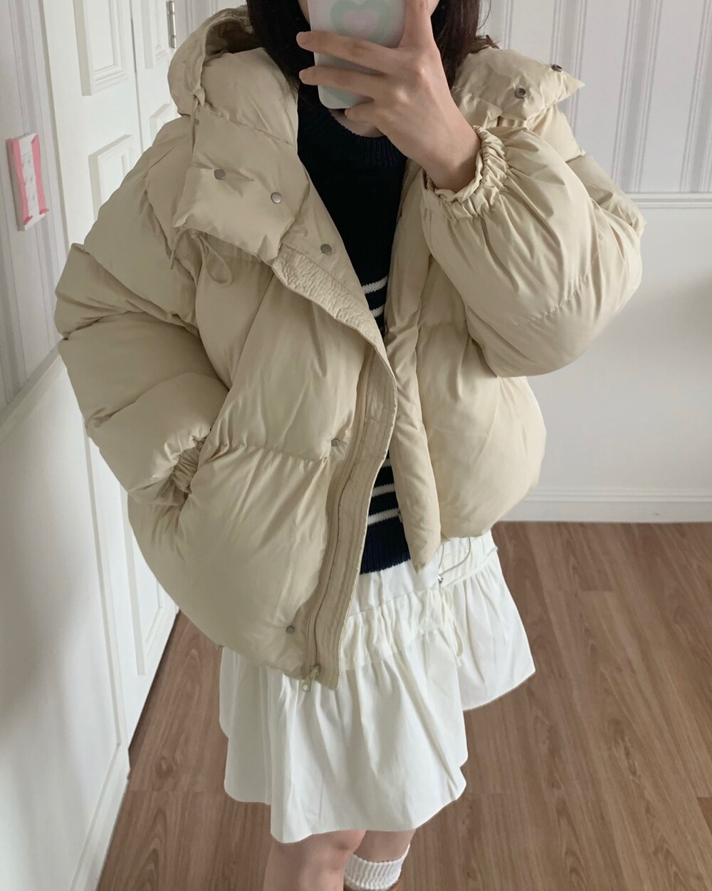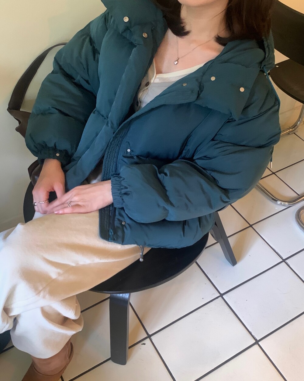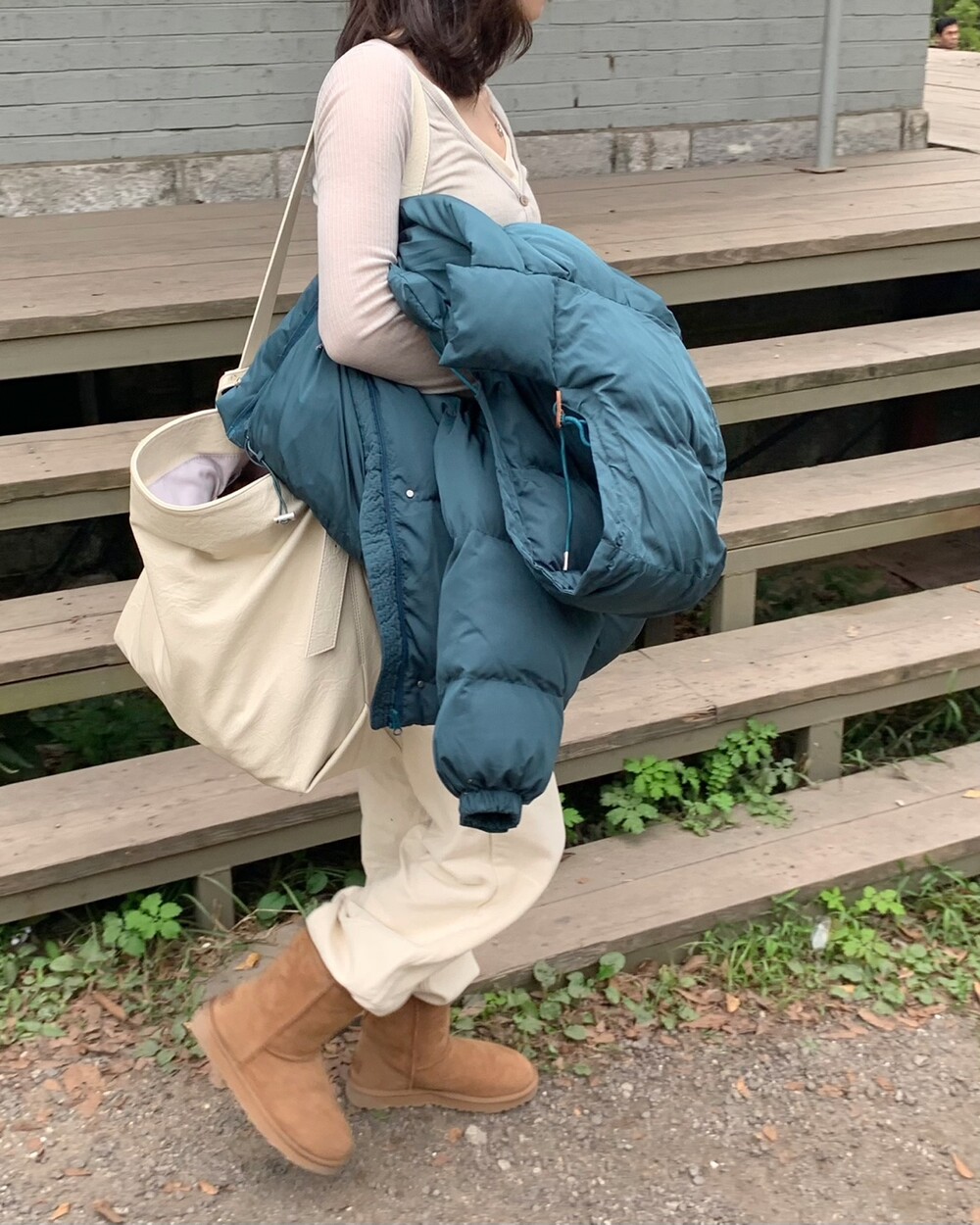 적당하게 숏한 기장감에 밑단에는 스토퍼 스트링이 달려있어 약간의 길이 조절이 가능한 제품이구요! 때문에 150대의 키작녀 분들도 부담없이착용하시기 좋은, 150-170까지 모든 신장에 두루 잘 어울리게 알맞는 핏이라고 소개할 수 있을 것 같아요 ㅎㅎ 저는 개인적으로 코트는 엉덩이를 덮어도 좋지만, 패딩만큼은 숏 기장이 더 편하고 웨어러블하게 활용되는 것 같더라구요! (어느 순간부터 숏 패딩을 더 선호하게 된.. ☆) 몸통 품도 아주 넉넉하고 여유있으니 66이상도 완전히 OK 이구요! 짧지도/길지도 않은 딱 귀여운 기장감으로 마무리 되어서 다양한 바텀과 매치하기 좋으실거에요. 데님이나 조거 같은 데일리 코디는 물론이구, 미니 스커트 또는 부츠와 함께 페미닌하게 연출하셔도 어색하지 않답니다.