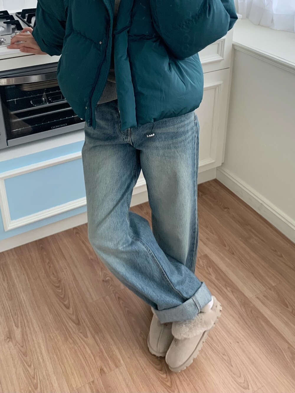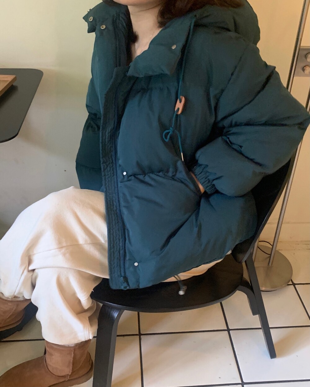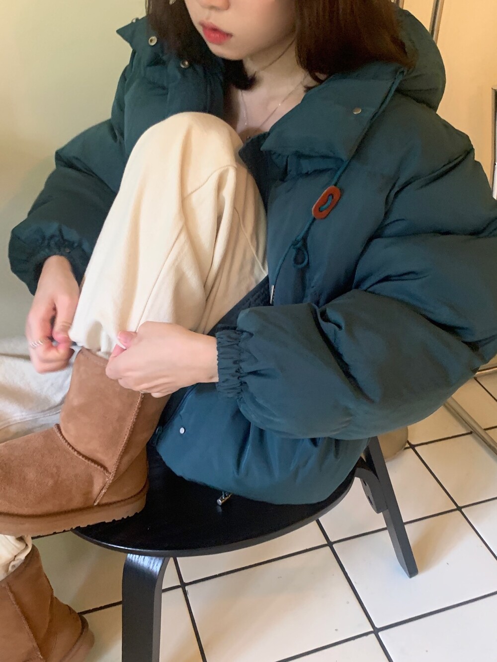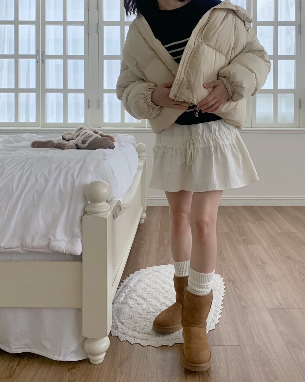 적당하게 숏한 기장감에 밑단에는 스토퍼 스트링이 달려있어 약간의 길이 조절이 가능한 제품이구요! 때문에 150대의 키작녀 분들도 부담없이착용하시기 좋은, 150-170까지 모든 신장에 두루 잘 어울리게 알맞는 핏이라고 소개할 수 있을 것 같아요 ㅎㅎ 저는 개인적으로 코트는 엉덩이를 덮어도 좋지만, 패딩만큼은 숏 기장이 더 편하고 웨어러블하게 활용되는 것 같더라구요! (어느 순간부터 숏 패딩을 더 선호하게 된.. ☆) 몸통 품도 아주 넉넉하고 여유있으니 66이상도 완전히 OK 이구요! 짧지도/길지도 않은 딱 귀여운 기장감으로 마무리 되어서 다양한 바텀과 매치하기 좋으실거에요. 데님이나 조거 같은 데일리 코디는 물론이구, 미니 스커트 또는 부츠와 함께 페미닌하게 연출하셔도 어색하지 않답니다.