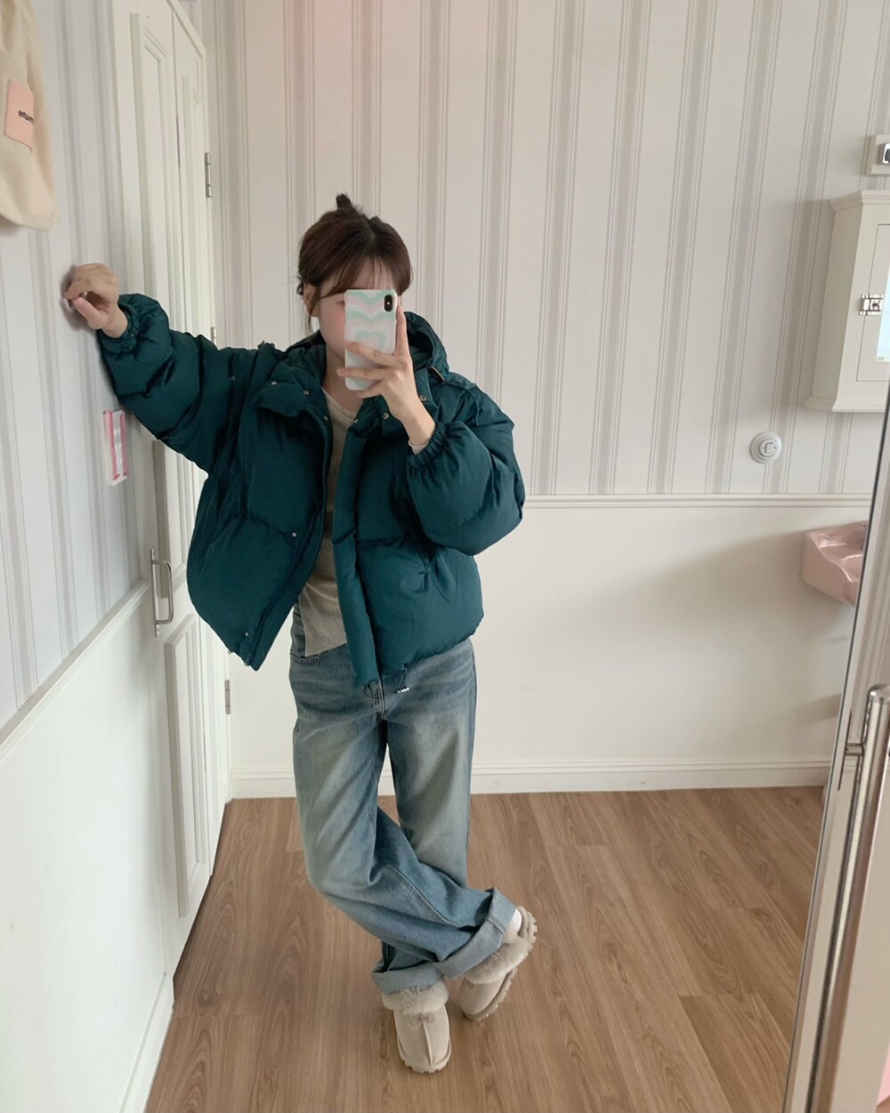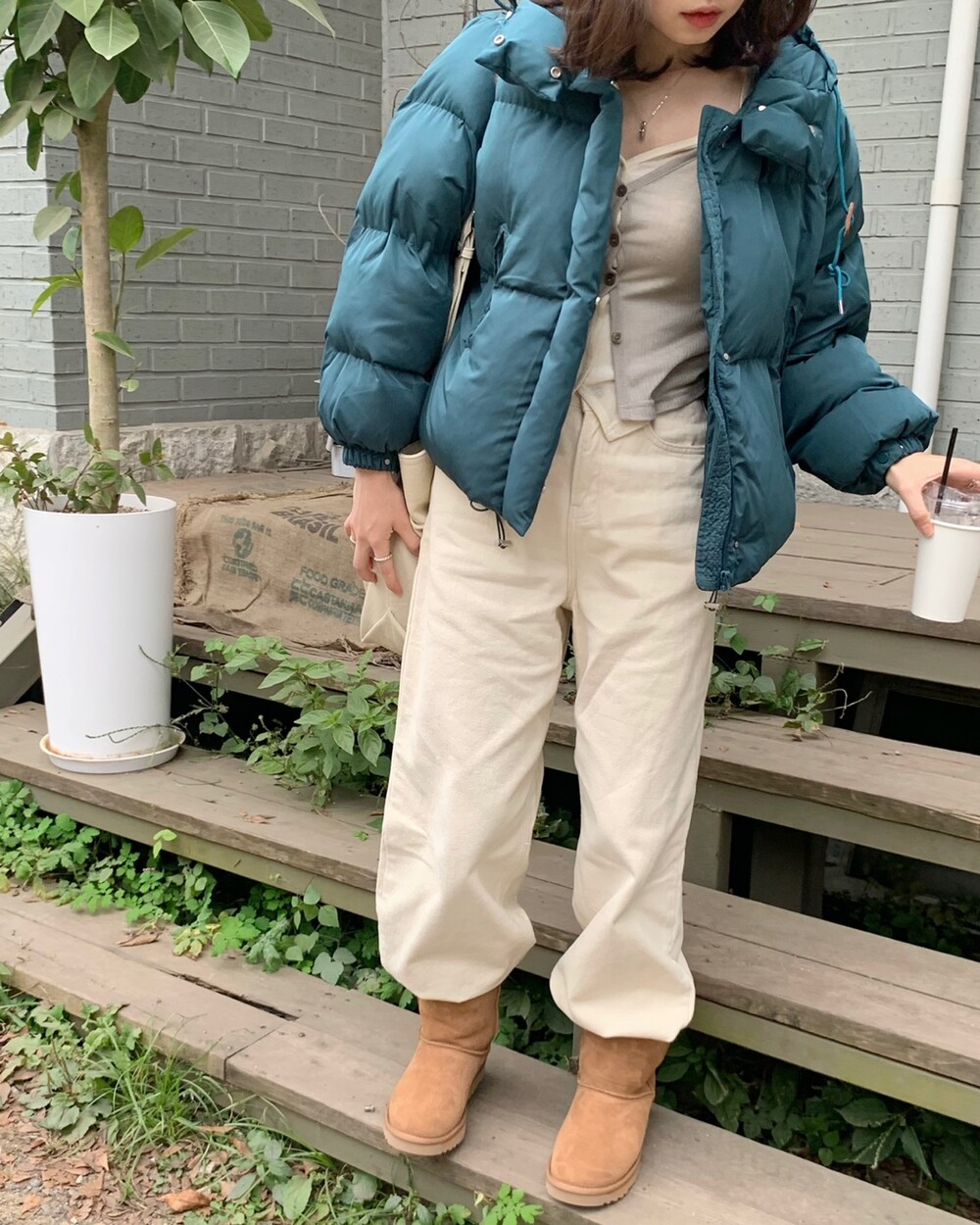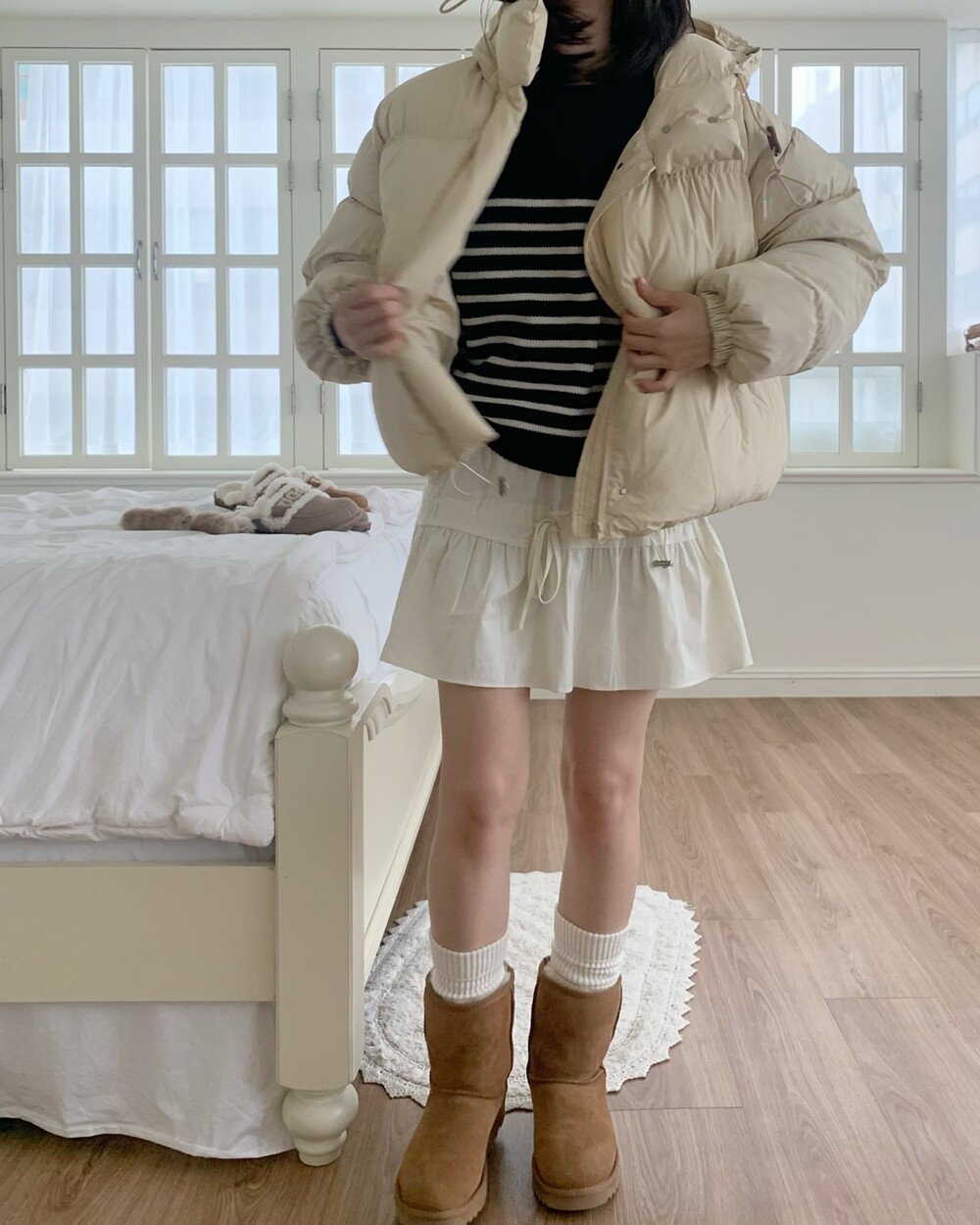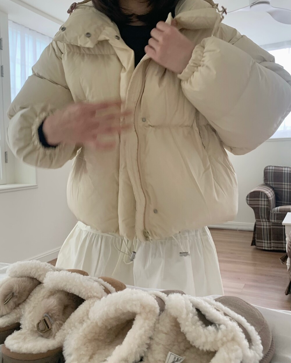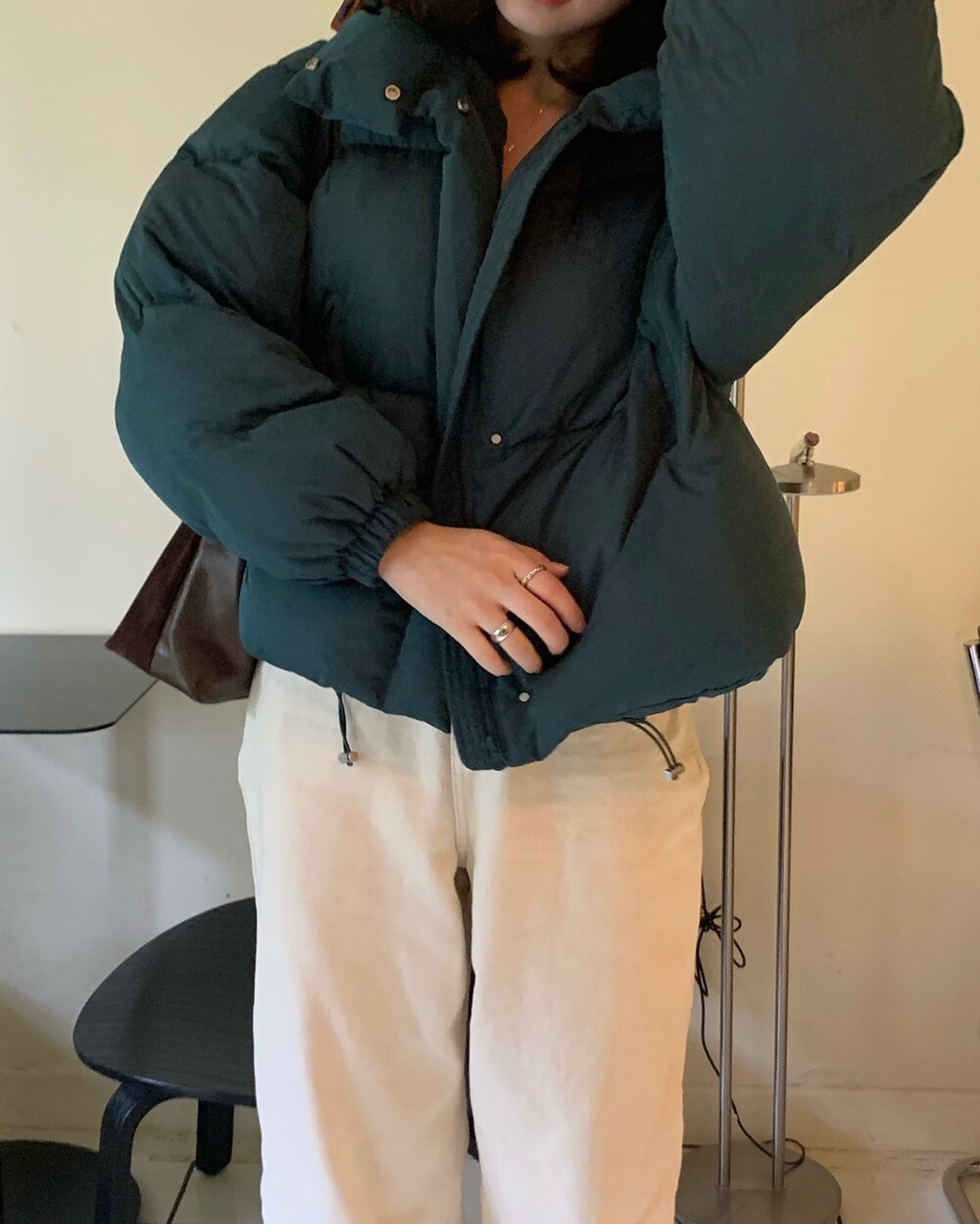 적당하게 숏한 기장감에 밑단에는 스토퍼 스트링이 달려있어 약간의 길이 조절이 가능한 제품이구요! 때문에 150대의 키작녀 분들도 부담없이착용하시기 좋은, 150-170까지 모든 신장에 두루 잘 어울리게 알맞는 핏이라고 소개할 수 있을 것 같아요 ㅎㅎ 저는 개인적으로 코트는 엉덩이를 덮어도 좋지만, 패딩만큼은 숏 기장이 더 편하고 웨어러블하게 활용되는 것 같더라구요! (어느 순간부터 숏 패딩을 더 선호하게 된.. ☆) 몸통 품도 아주 넉넉하고 여유있으니 66이상도 완전히 OK 이구요! 짧지도/길지도 않은 딱 귀여운 기장감으로 마무리 되어서 다양한 바텀과 매치하기 좋으실거에요. 데님이나 조거 같은 데일리 코디는 물론이구, 미니 스커트 또는 부츠와 함께 페미닌하게 연출하셔도 어색하지 않답니다.