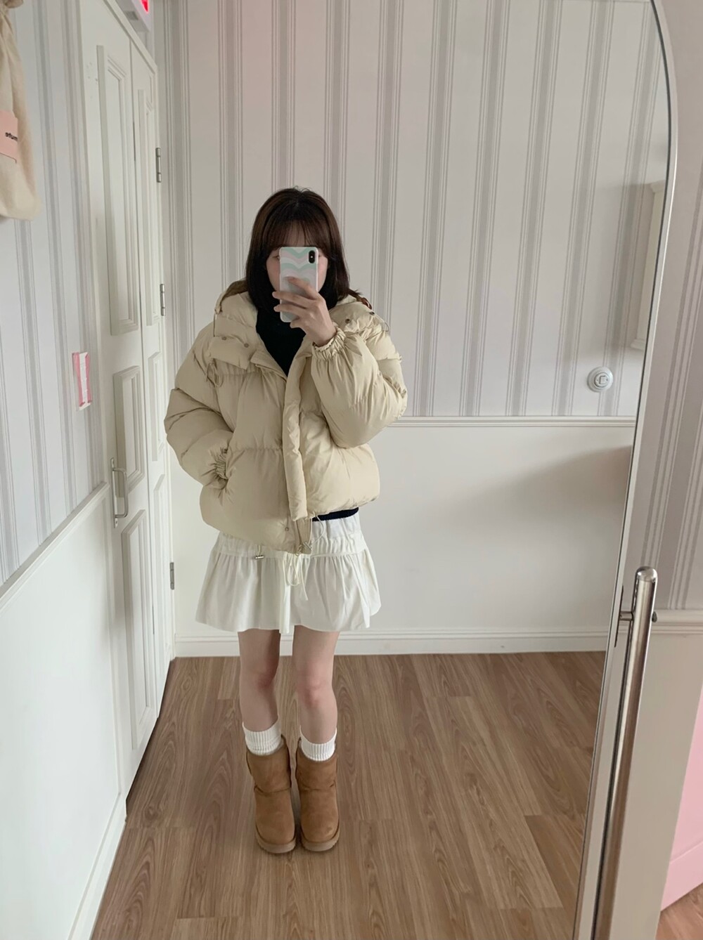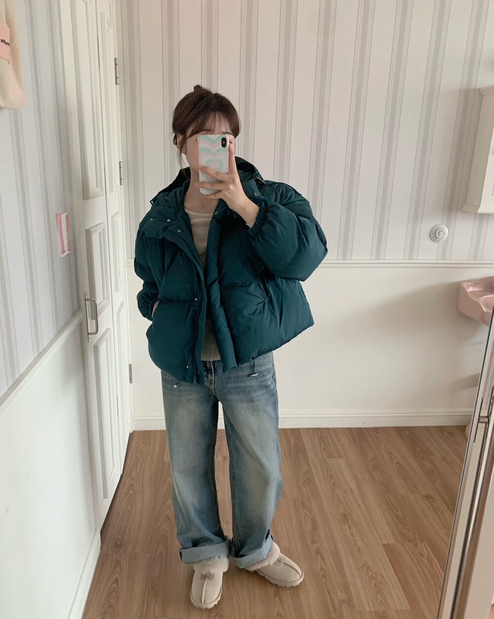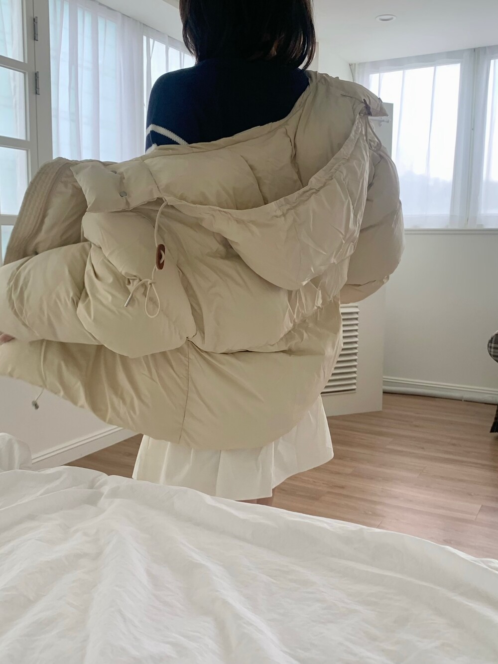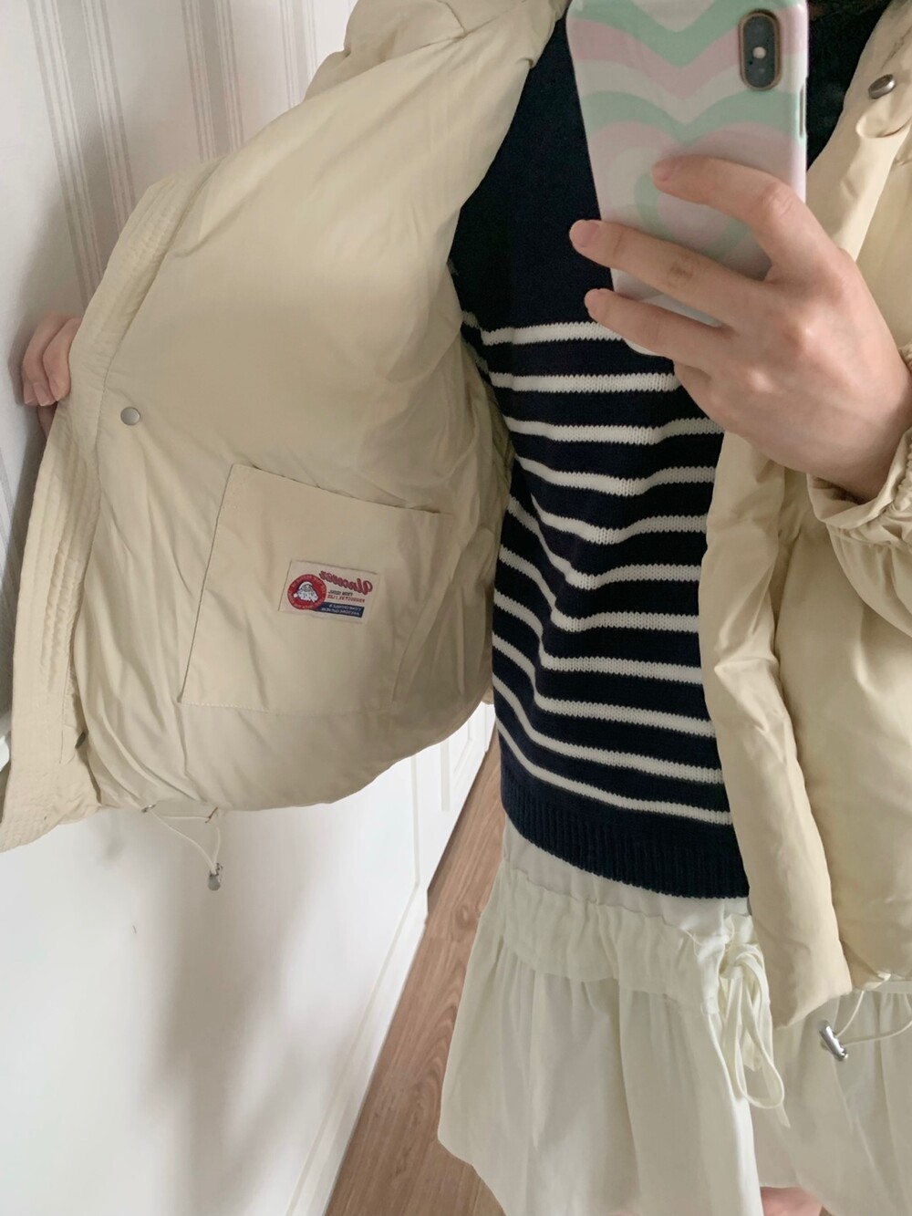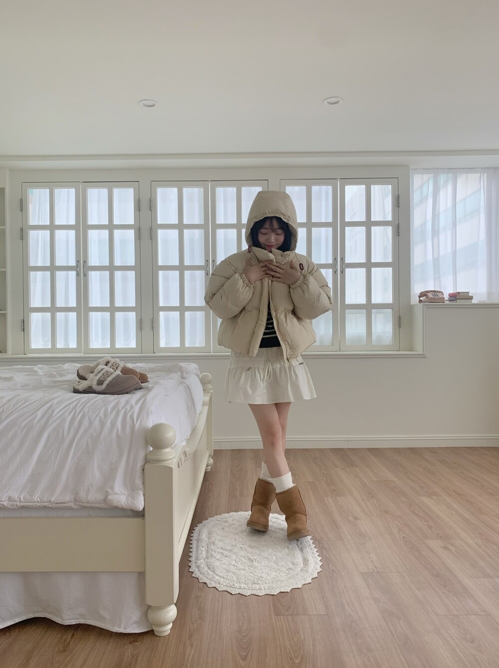 적당하게 숏한 기장감에 밑단에는 스토퍼 스트링이 달려있어 약간의 길이 조절이 가능한 제품이구요! 때문에 150대의 키작녀 분들도 부담없이착용하시기 좋은, 150-170까지 모든 신장에 두루 잘 어울리게 알맞는 핏이라고 소개할 수 있을 것 같아요 ㅎㅎ 저는 개인적으로 코트는 엉덩이를 덮어도 좋지만, 패딩만큼은 숏 기장이 더 편하고 웨어러블하게 활용되는 것 같더라구요! (어느 순간부터 숏 패딩을 더 선호하게 된.. ☆) 몸통 품도 아주 넉넉하고 여유있으니 66이상도 완전히 OK 이구요! 짧지도/길지도 않은 딱 귀여운 기장감으로 마무리 되어서 다양한 바텀과 매치하기 좋으실거에요. 데님이나 조거 같은 데일리 코디는 물론이구, 미니 스커트 또는 부츠와 함께 페미닌하게 연출하셔도 어색하지 않답니다.