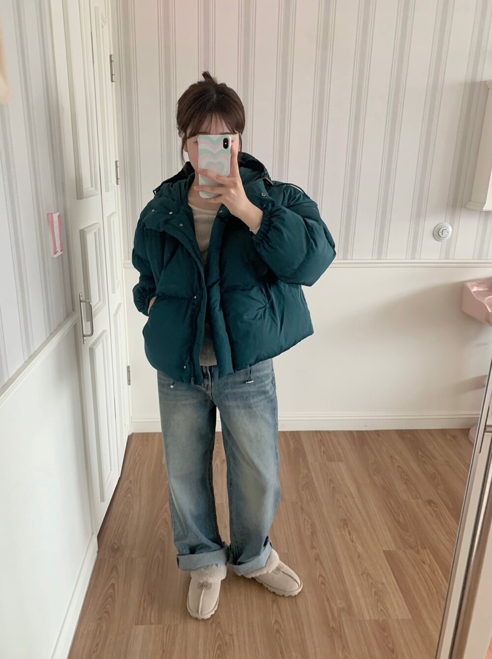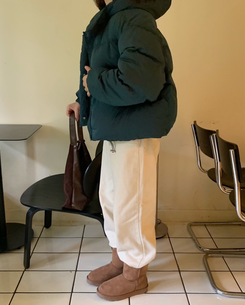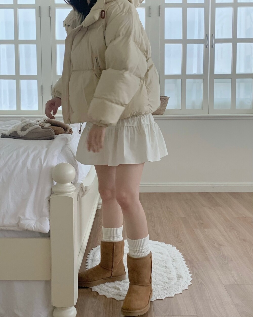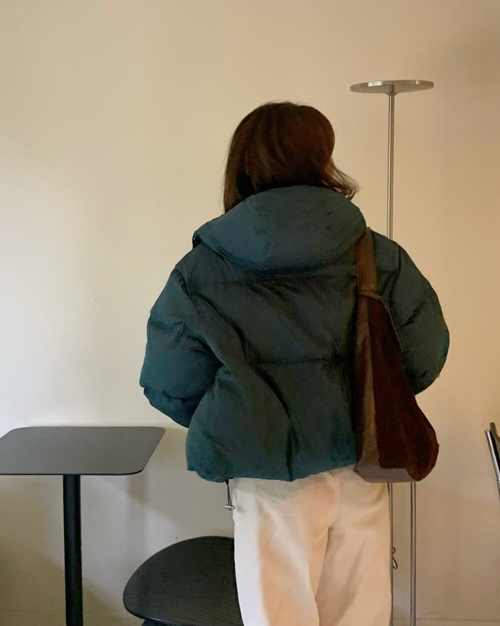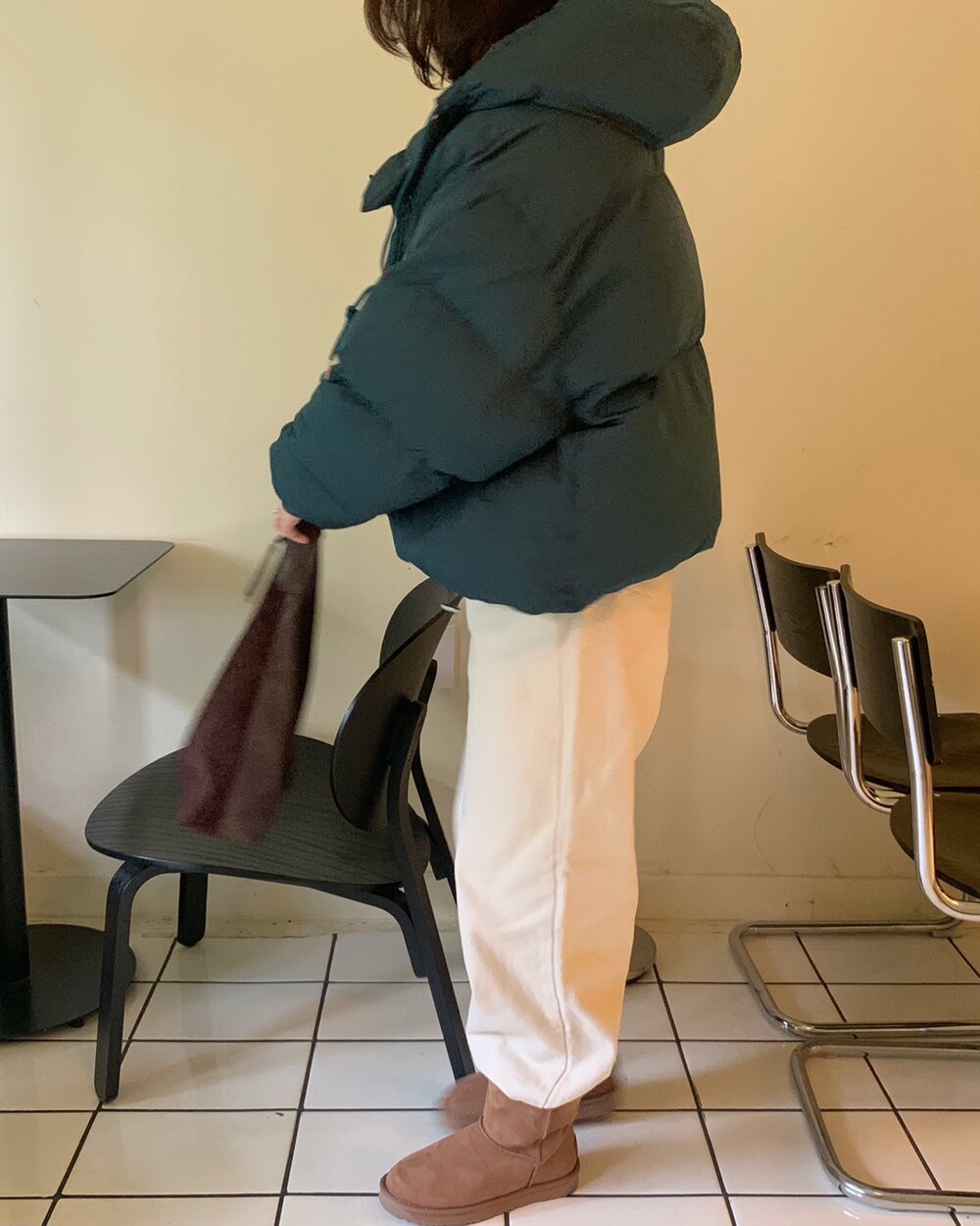 적당하게 숏한 기장감에 밑단에는 스토퍼 스트링이 달려있어 약간의 길이 조절이 가능한 제품이구요! 때문에 150대의 키작녀 분들도 부담없이착용하시기 좋은, 150-170까지 모든 신장에 두루 잘 어울리게 알맞는 핏이라고 소개할 수 있을 것 같아요 ㅎㅎ 저는 개인적으로 코트는 엉덩이를 덮어도 좋지만, 패딩만큼은 숏 기장이 더 편하고 웨어러블하게 활용되는 것 같더라구요! (어느 순간부터 숏 패딩을 더 선호하게 된.. ☆) 몸통 품도 아주 넉넉하고 여유있으니 66이상도 완전히 OK 이구요! 짧지도/길지도 않은 딱 귀여운 기장감으로 마무리 되어서 다양한 바텀과 매치하기 좋으실거에요. 데님이나 조거 같은 데일리 코디는 물론이구, 미니 스커트 또는 부츠와 함께 페미닌하게 연출하셔도 어색하지 않답니다.
