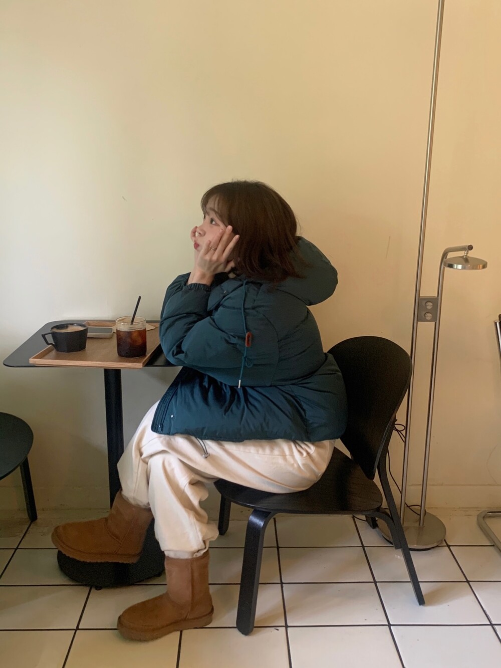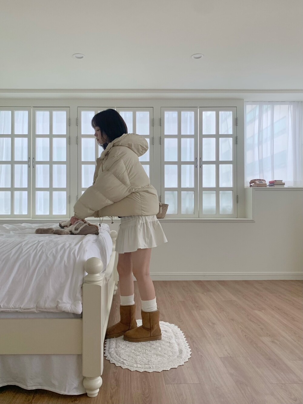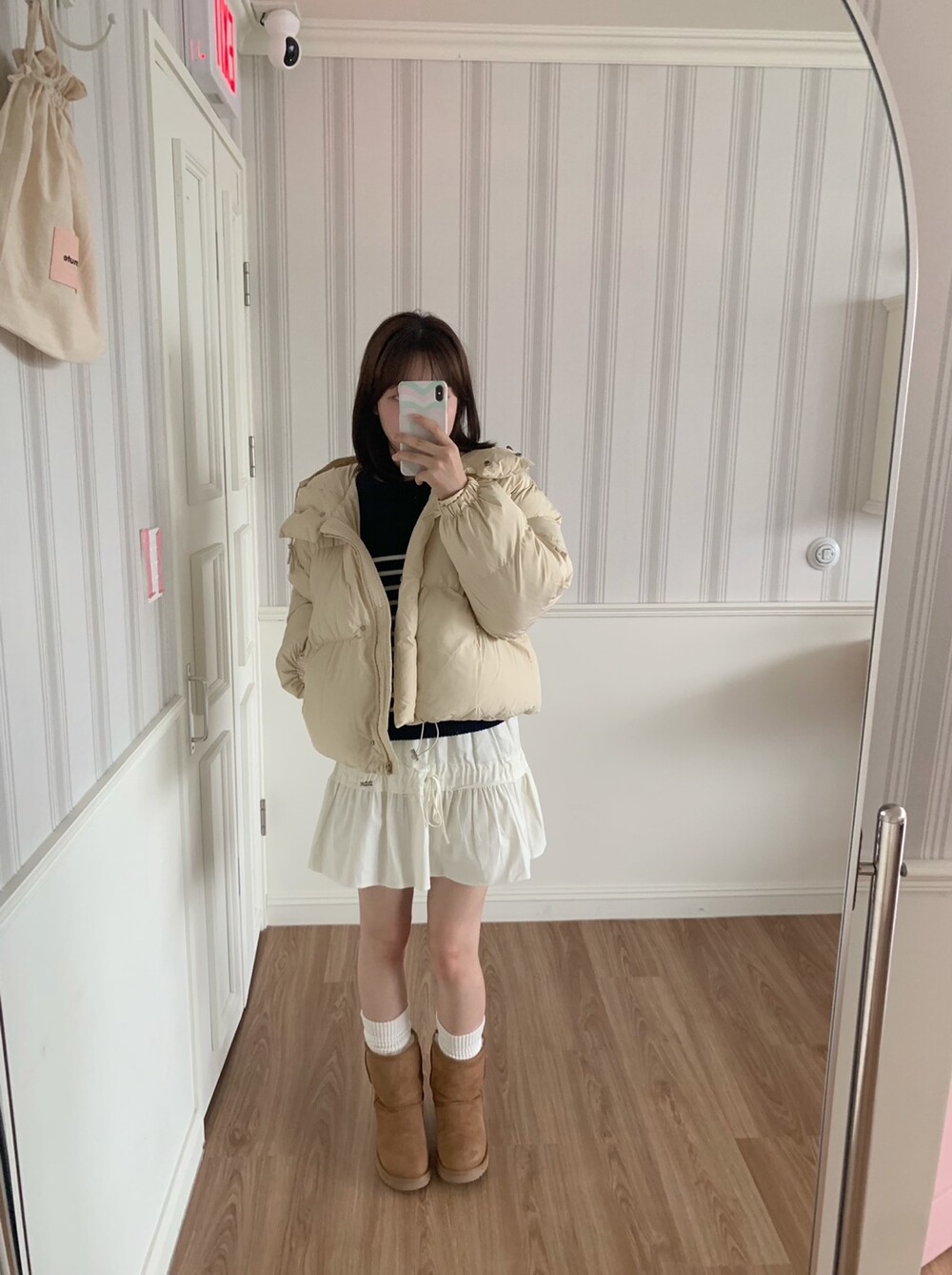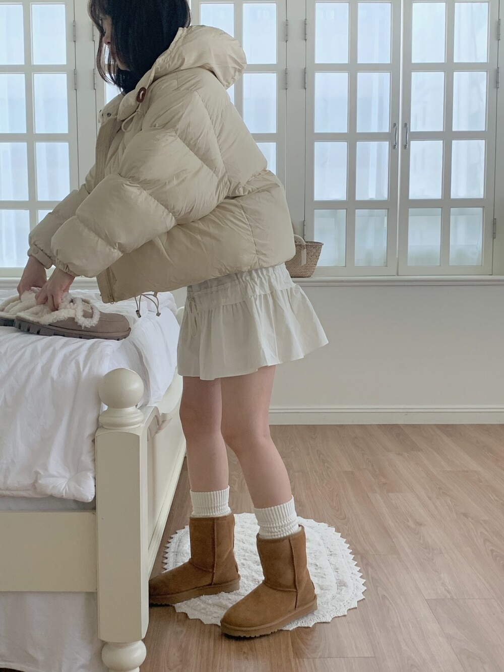 적당하게 숏한 기장감에 밑단에는 스토퍼 스트링이 달려있어 약간의 길이 조절이 가능한 제품이구요! 때문에 150대의 키작녀 분들도 부담없이착용하시기 좋은, 150-170까지 모든 신장에 두루 잘 어울리게 알맞는 핏이라고 소개할 수 있을 것 같아요 ㅎㅎ 저는 개인적으로 코트는 엉덩이를 덮어도 좋지만, 패딩만큼은 숏 기장이 더 편하고 웨어러블하게 활용되는 것 같더라구요! (어느 순간부터 숏 패딩을 더 선호하게 된.. ☆) 몸통 품도 아주 넉넉하고 여유있으니 66이상도 완전히 OK 이구요! 짧지도/길지도 않은 딱 귀여운 기장감으로 마무리 되어서 다양한 바텀과 매치하기 좋으실거에요. 데님이나 조거 같은 데일리 코디는 물론이구, 미니 스커트 또는 부츠와 함께 페미닌하게 연출하셔도 어색하지 않답니다.