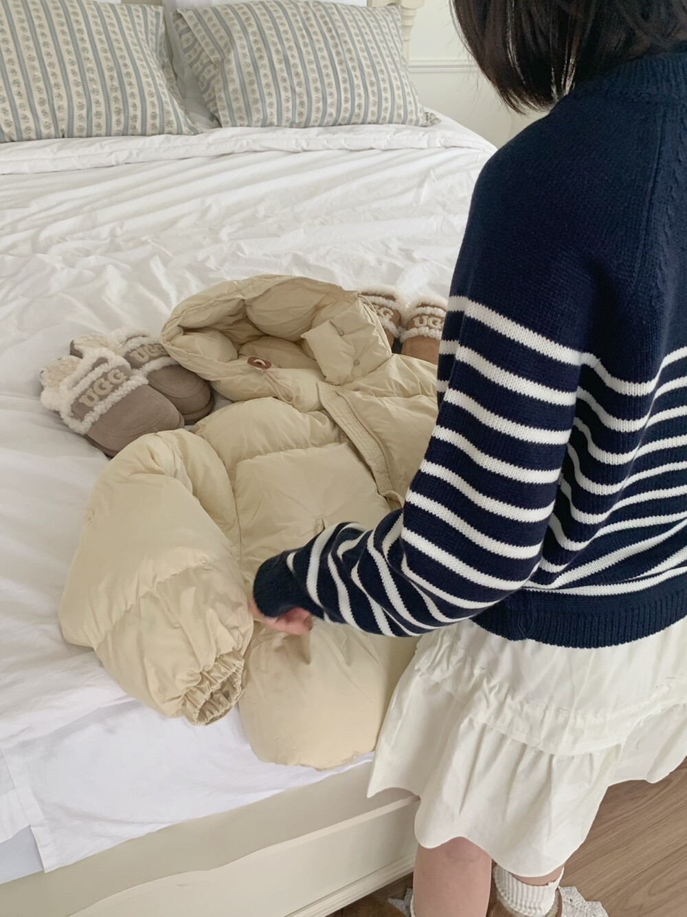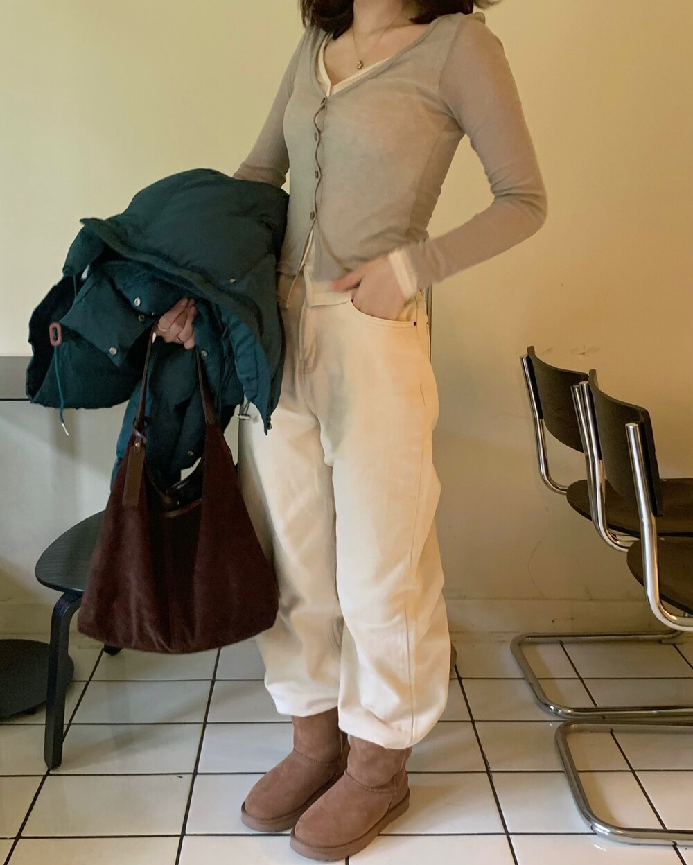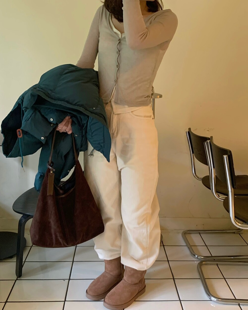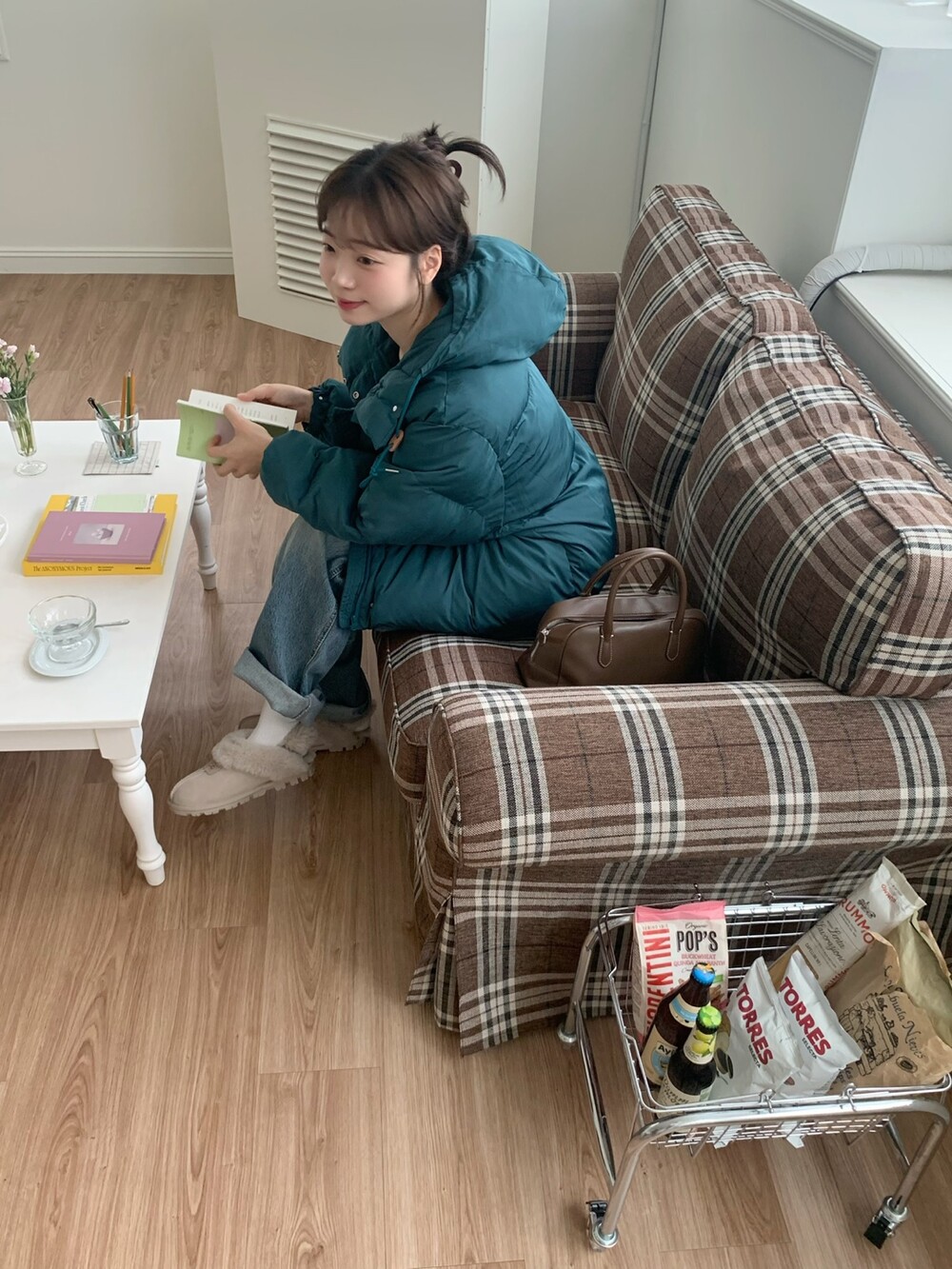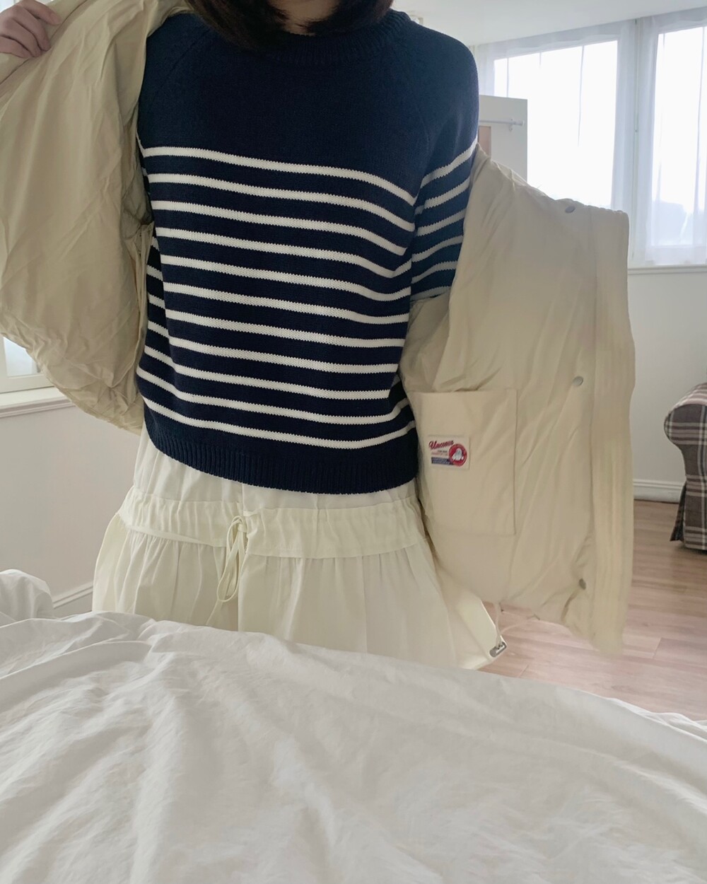 적당하게 숏한 기장감에 밑단에는 스토퍼 스트링이 달려있어 약간의 길이 조절이 가능한 제품이구요! 때문에 150대의 키작녀 분들도 부담없이착용하시기 좋은, 150-170까지 모든 신장에 두루 잘 어울리게 알맞는 핏이라고 소개할 수 있을 것 같아요 ㅎㅎ 저는 개인적으로 코트는 엉덩이를 덮어도 좋지만, 패딩만큼은 숏 기장이 더 편하고 웨어러블하게 활용되는 것 같더라구요! (어느 순간부터 숏 패딩을 더 선호하게 된.. ☆) 몸통 품도 아주 넉넉하고 여유있으니 66이상도 완전히 OK 이구요! 짧지도/길지도 않은 딱 귀여운 기장감으로 마무리 되어서 다양한 바텀과 매치하기 좋으실거에요. 데님이나 조거 같은 데일리 코디는 물론이구, 미니 스커트 또는 부츠와 함께 페미닌하게 연출하셔도 어색하지 않답니다.