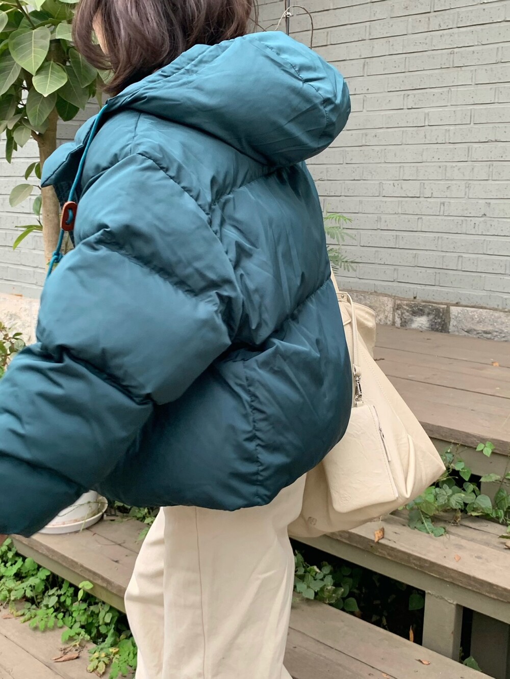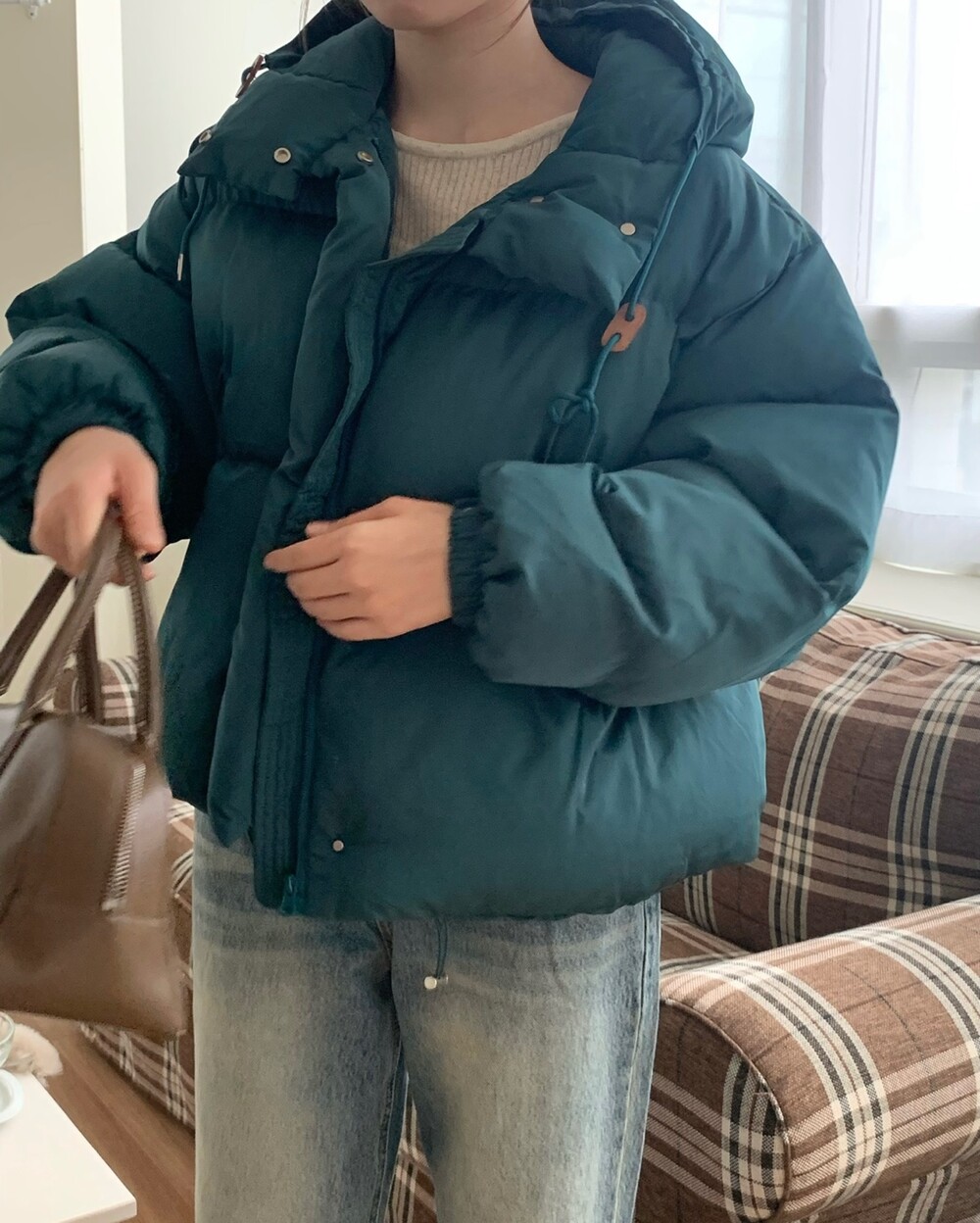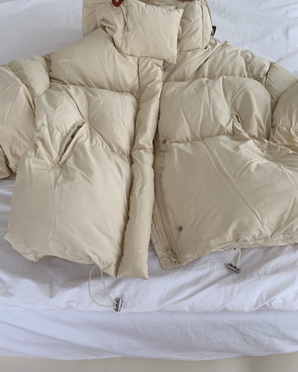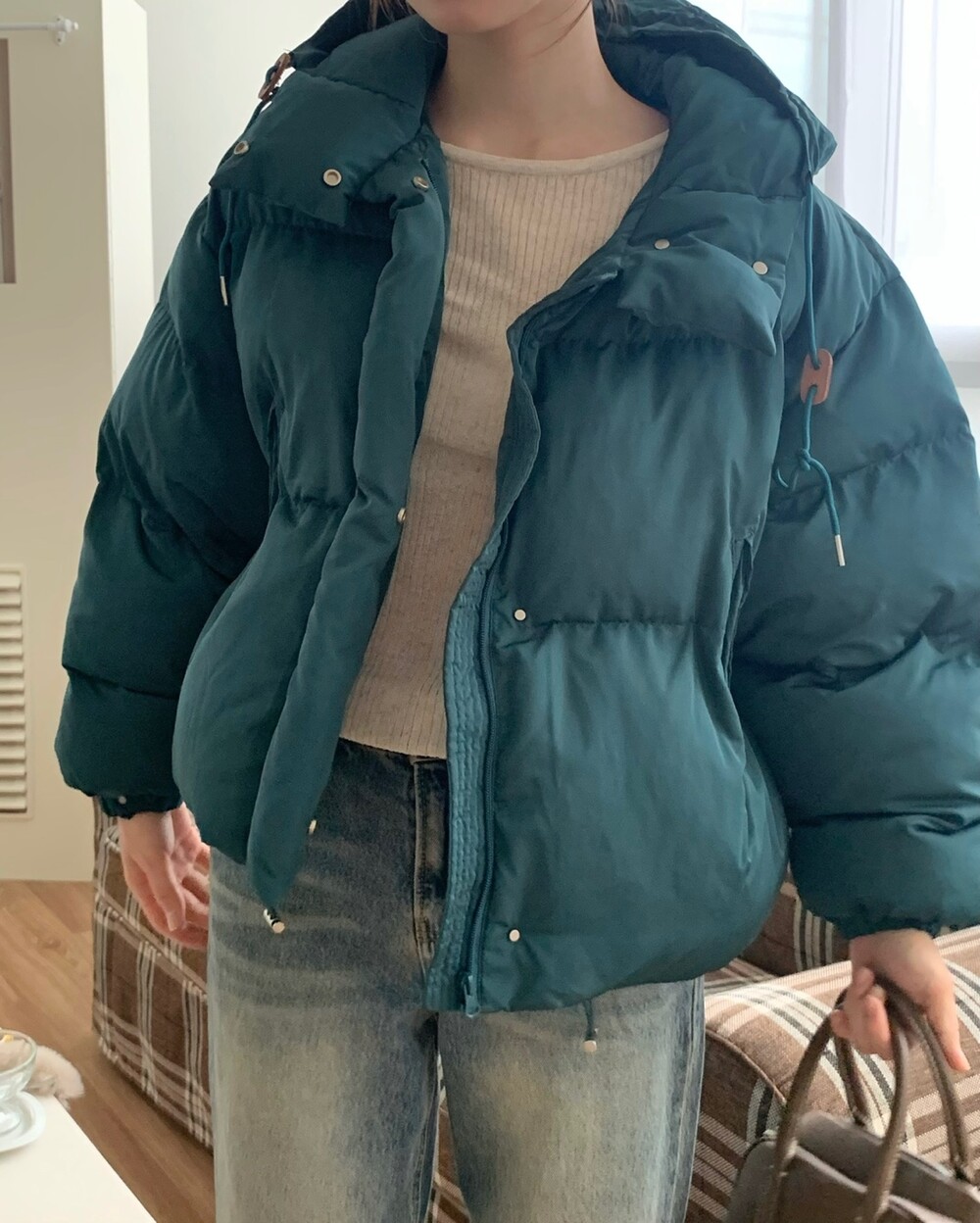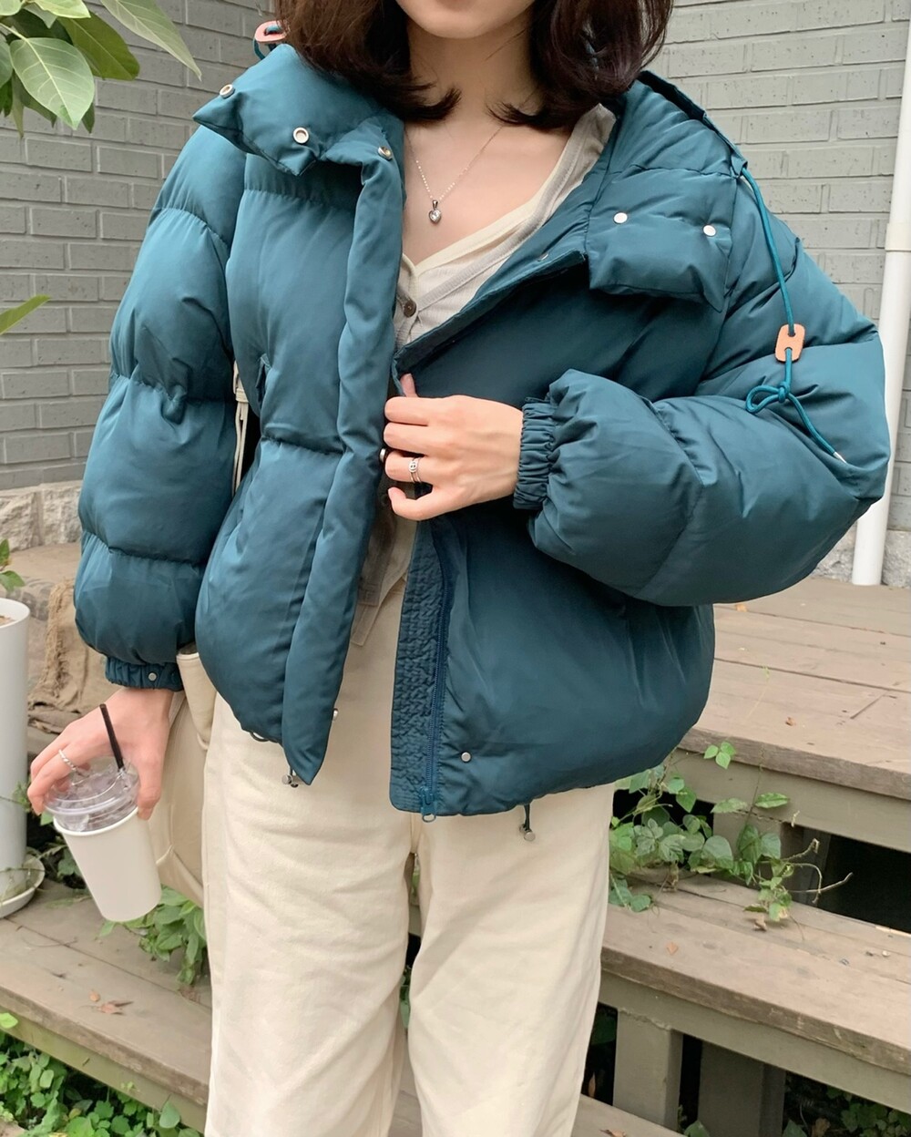거기다 브라운 후드 스트링 + 가죽탭이 들어가서 다른 무난한 디자인의 보세 숏패딩과는 약간의 차별화를 줄 수 있었구요! 하이넥 클로징 디테일로 머플러가 없어도 바람을 차단해주며 넥라인을 따뜻하게 감싸주고 있답니다! 끝까지 올려 착용하셔도 너무 귀엽고, 답답하지 않았던 점은 덤이에요! ^.^ 전체 클로징은 지퍼 + 단추까지 이중으로 더해져서 편의성과 스타일을 모두 잡은 효녀같은 패딩이라고 봐주시면 되세요... 8만원대로 이 정도 디테일을 모두 잡고 있는 제품은 정말 없지 않을까 싶거든요.. 소맷단에도 스냅 버튼이 들어가있어 손 쉽게 조절이 가능해요. 구석구석 세심하게 들어가있는 디테일에 저는 입으면서도 계속해서 더 만족도가 높아지는 아이템이었던 것 같아요!