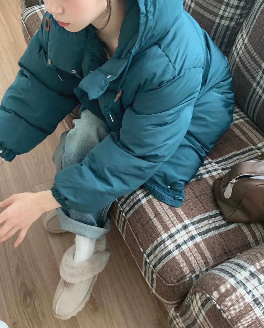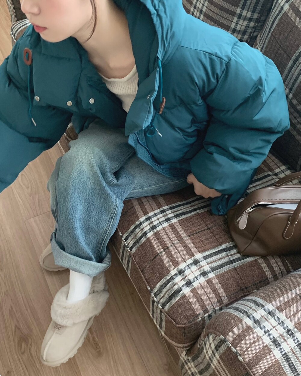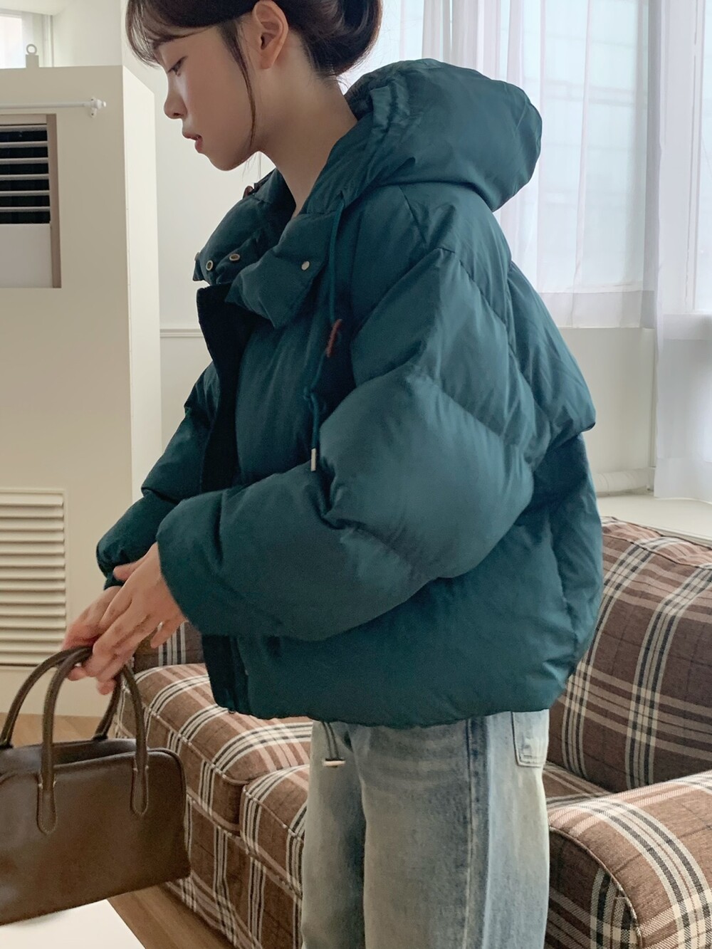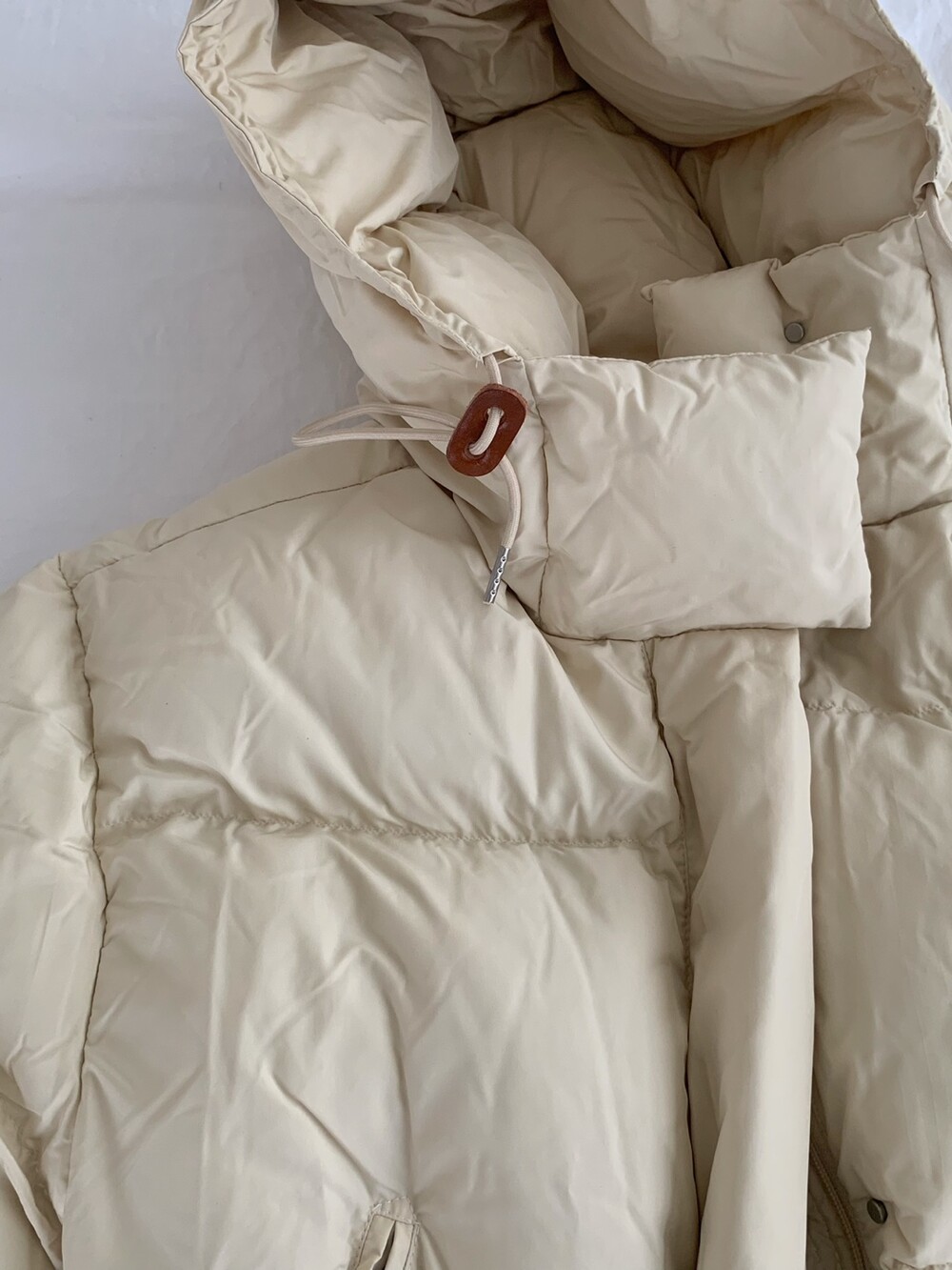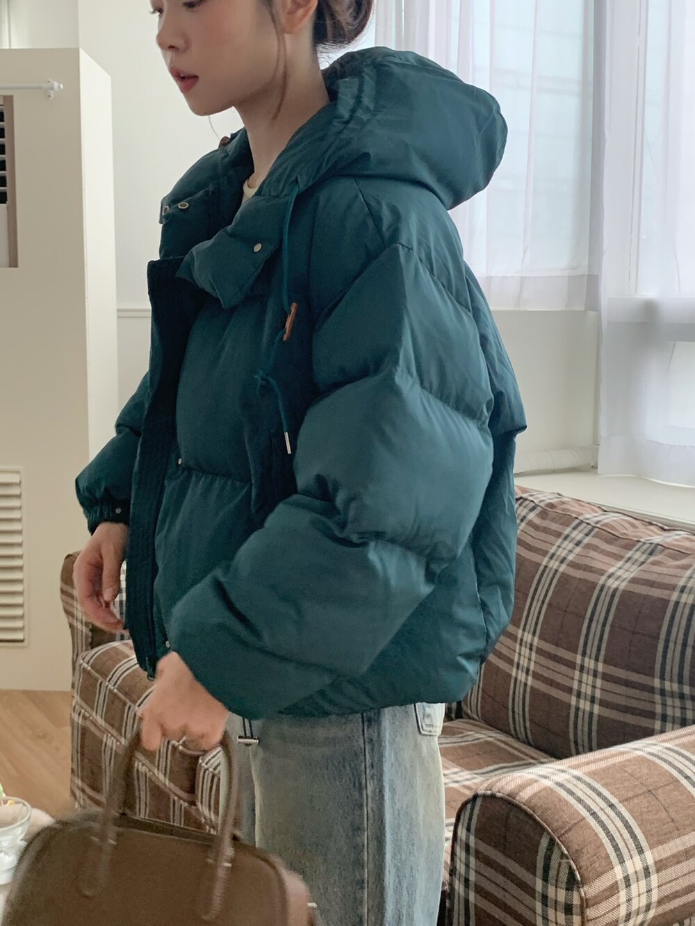 거기다 브라운 후드 스트링 + 가죽탭이 들어가서 다른 무난한 디자인의 보세 숏패딩과는 약간의 차별화를 줄 수 있었구요! 하이넥 클로징 디테일로 머플러가 없어도 바람을 차단해주며 넥라인을 따뜻하게 감싸주고 있답니다! 끝까지 올려 착용하셔도 너무 귀엽고, 답답하지 않았던 점은 덤이에요! ^.^ 전체 클로징은 지퍼 + 단추까지 이중으로 더해져서 편의성과 스타일을 모두 잡은 효녀같은 패딩이라고 봐주시면 되세요... 8만원대로 이 정도 디테일을 모두 잡고 있는 제품은 정말 없지 않을까 싶거든요.. 소맷단에도 스냅 버튼이 들어가있어 손 쉽게 조절이 가능해요. 구석구석 세심하게 들어가있는 디테일에 저는 입으면서도 계속해서 더 만족도가 높아지는 아이템이었던 것 같아요!