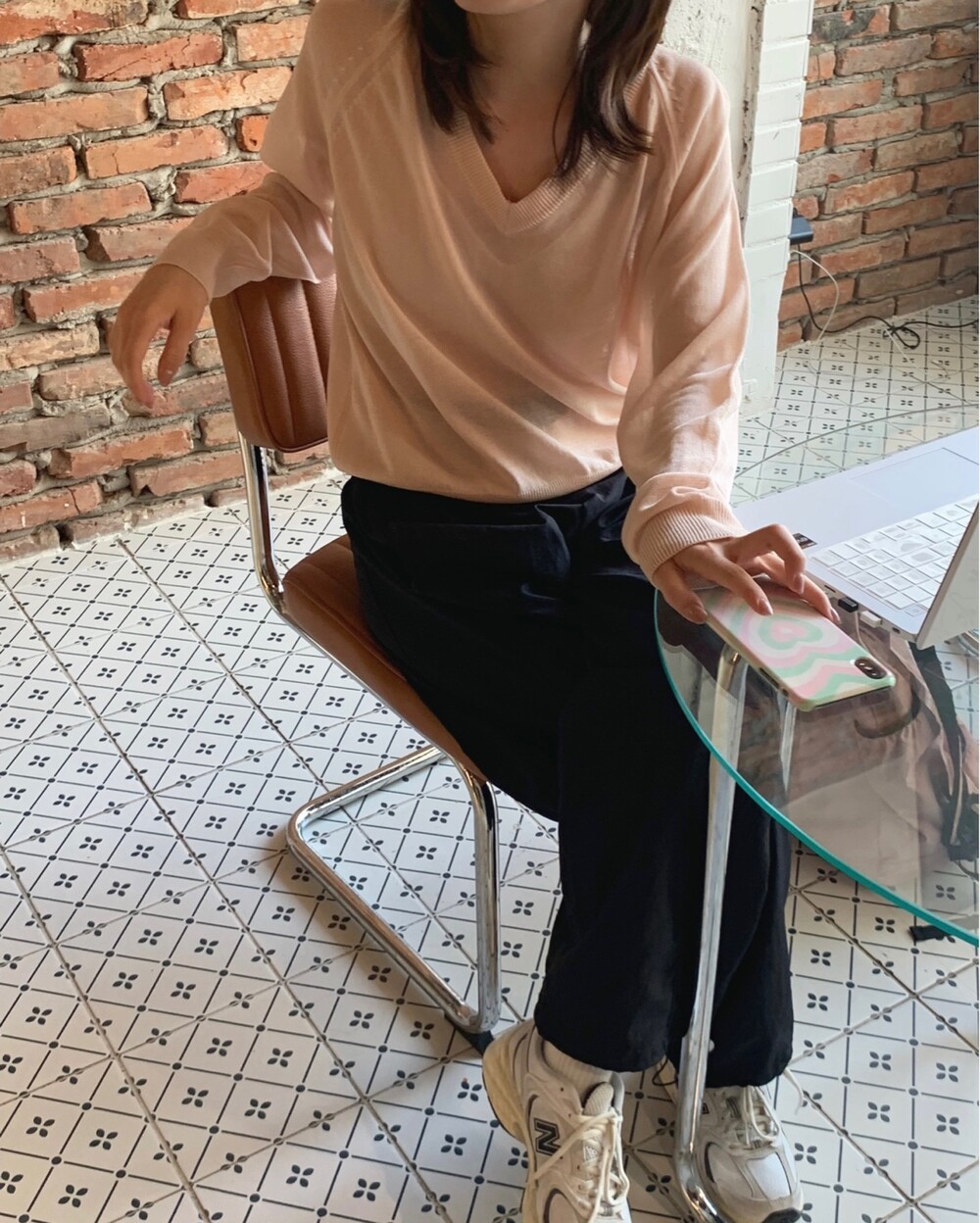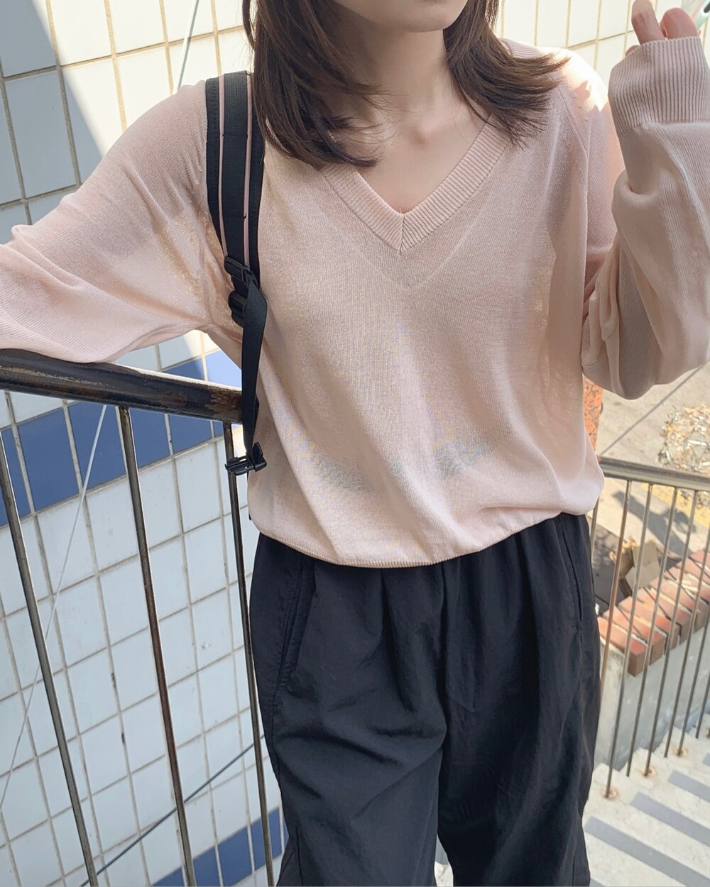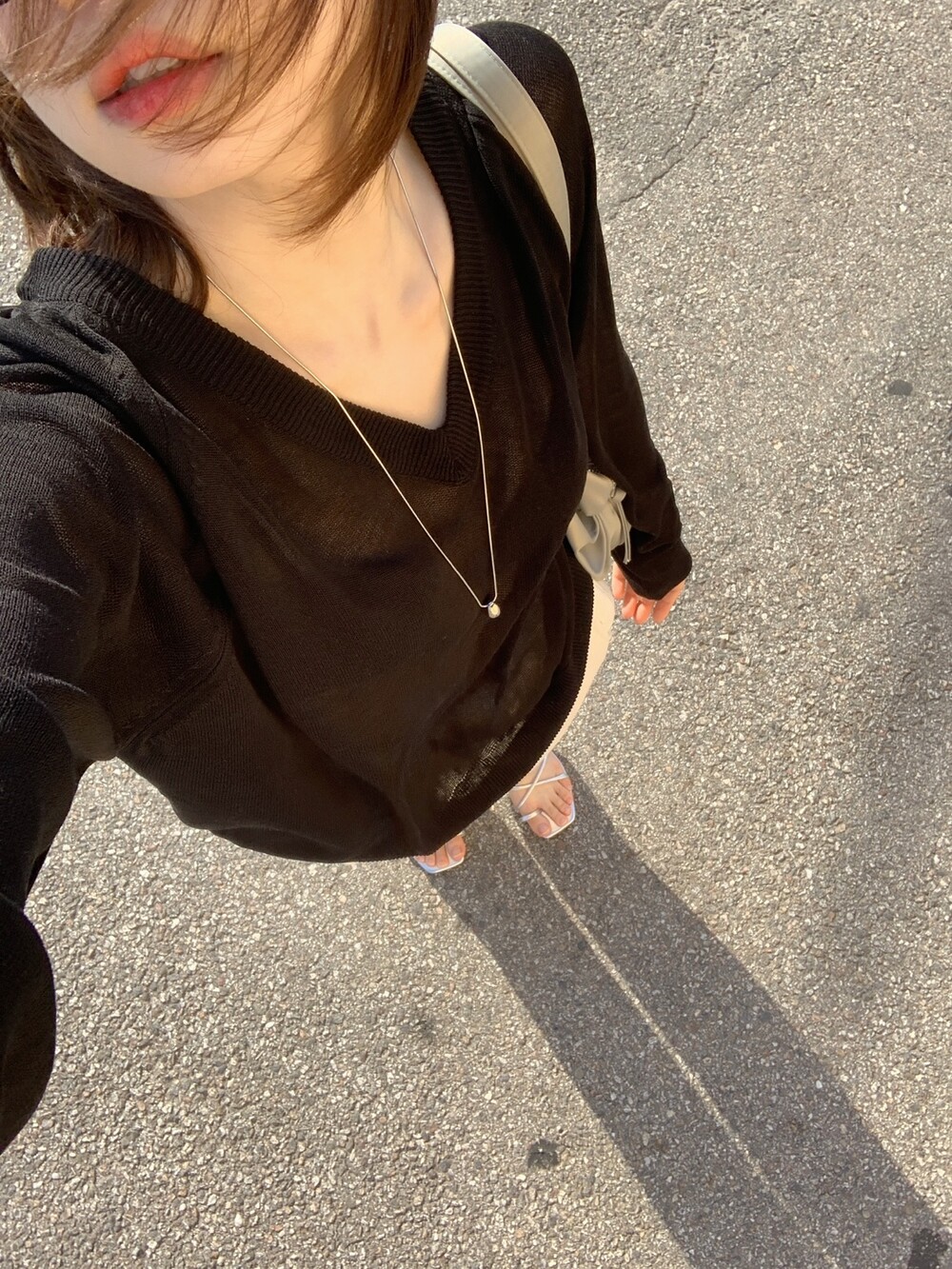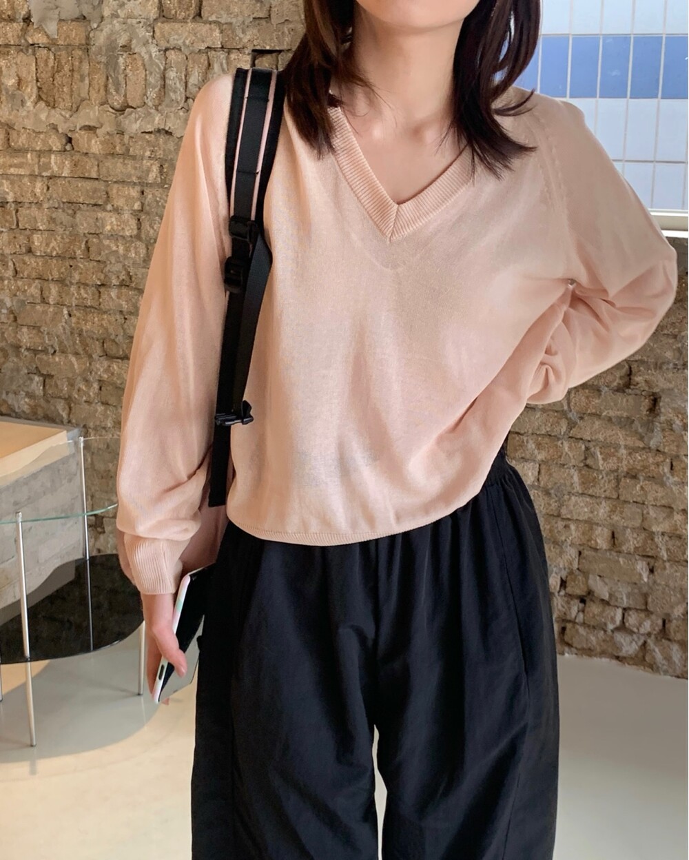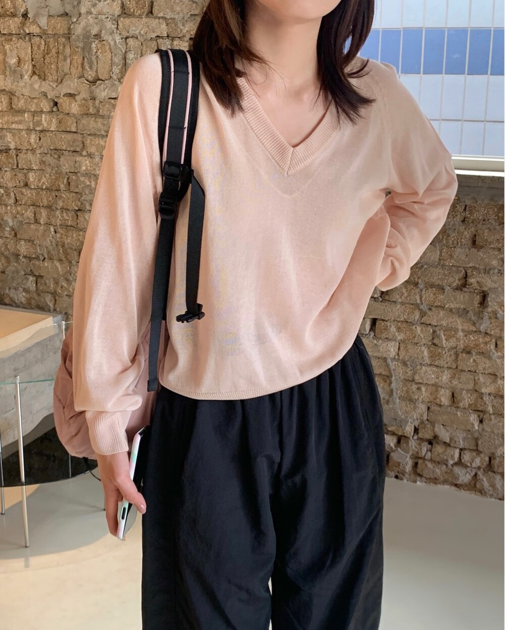 적당한 브이넥으로 시원하게 터 준 넥라인 덕분에, 니트라고 해도 절대