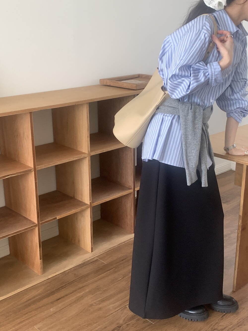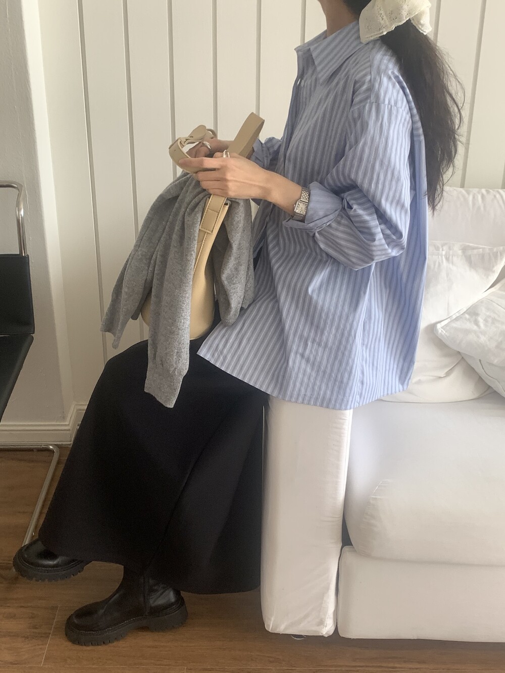 페미닌하면서 클래식한 분위기를, 루즈한 봄 니트와 함께하면