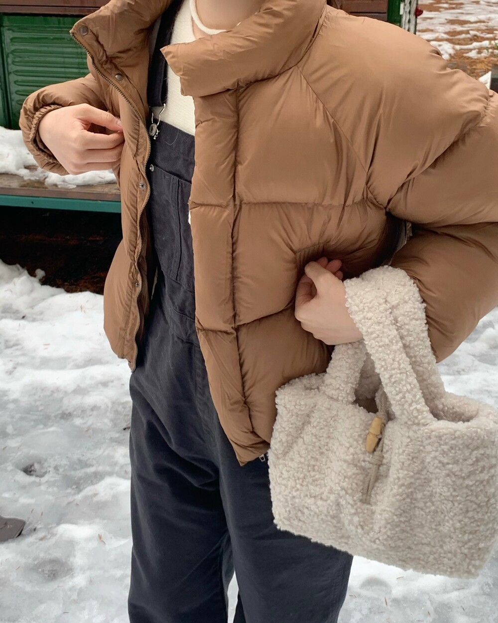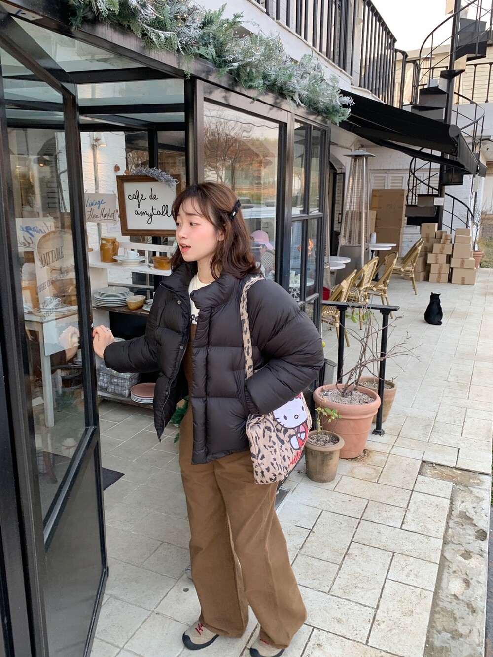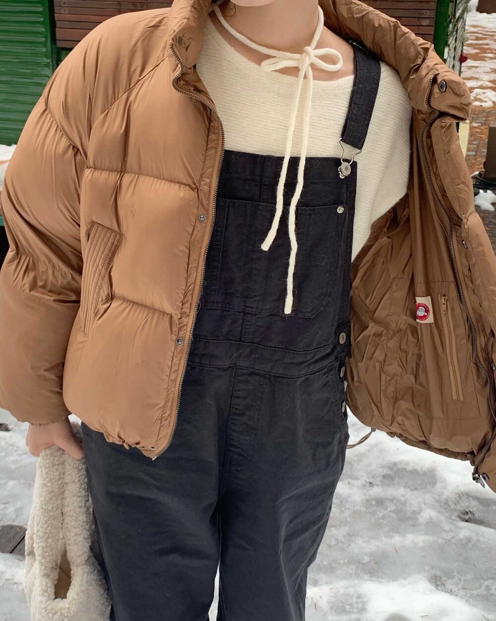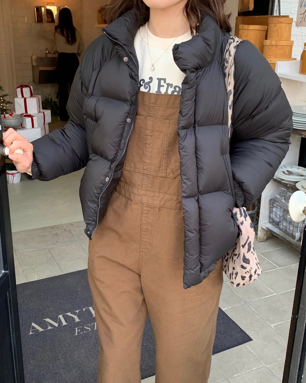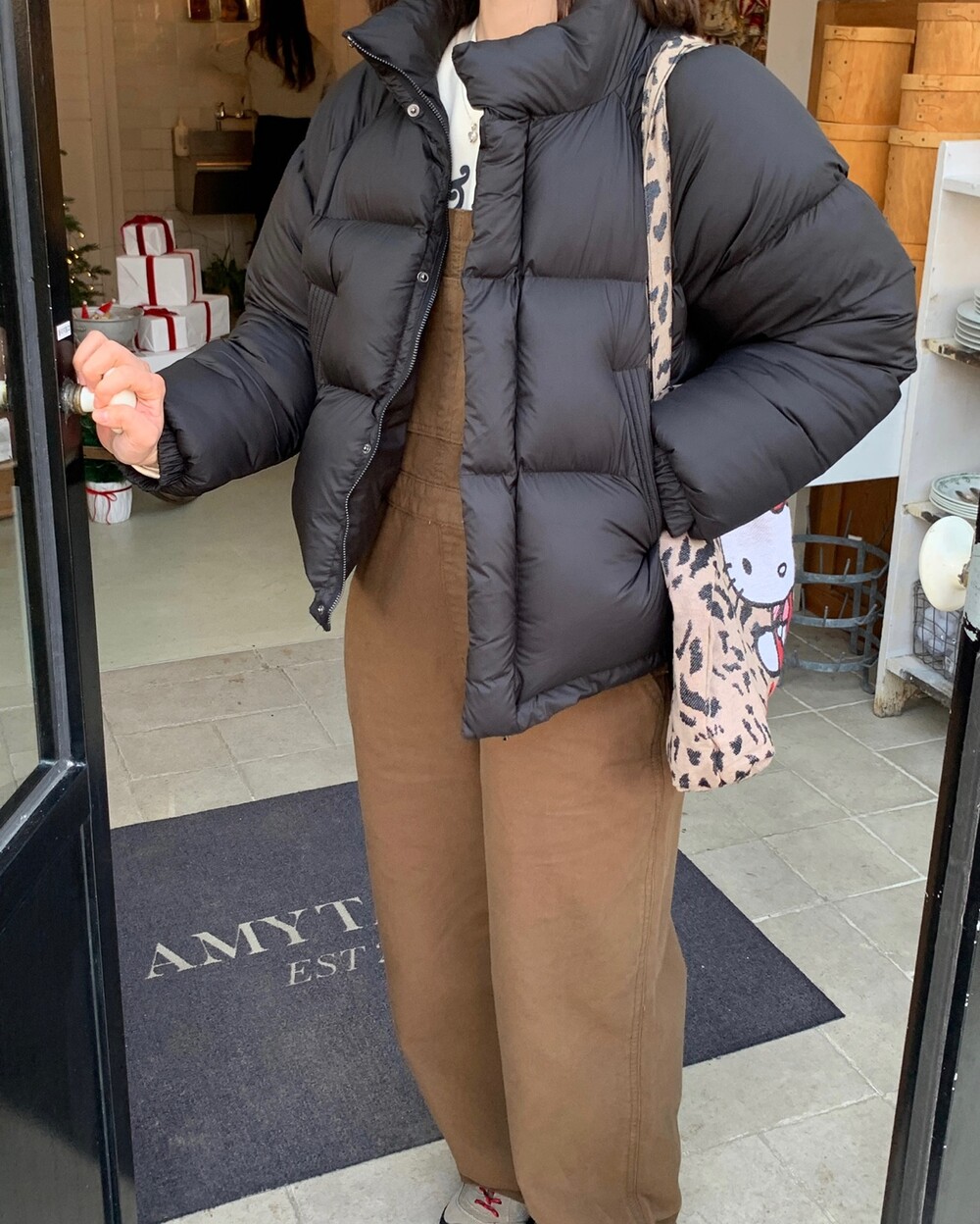 그런 제 마음을 아주 적절히 충족시킨 패딩이에요. 눈썰미 있으신 분들은 내부포켓 택 보고도 아시겠지만, 지난 *밤비 후드 패딩 과 같은 거래처에서 나온 제품이구요, 그것도 동일하게 웰론인데 정말 빵빵하고 따뜻했었죠? 아마 밤비 구매했던 분들 중에 만족하셨던 분들 계시다면 이 제품도 분명 마음에 드실거라 장담할 수 있어요 ㅎㅎ 후드 패딩에서 한층 더 담백하게! 후드도 떼고/가죽택도 떼고 깔끔+캐주얼 스타일로 나왔다 보시면 됩니다! 저는 두 제품 모두 소장하고 있지만, 확연히 다른 무드로 즐겨지는 제품들이고 확실히 이번 푸퍼 숏패딩이 더 자주 입게 되긴 하더라구요! 밤비는 귀엽고 발랄한 느낌이 느껴진다면, 요건 정말 취향 안 타고 누구나 편하게 즐기시기 좋은 스타일이에요.