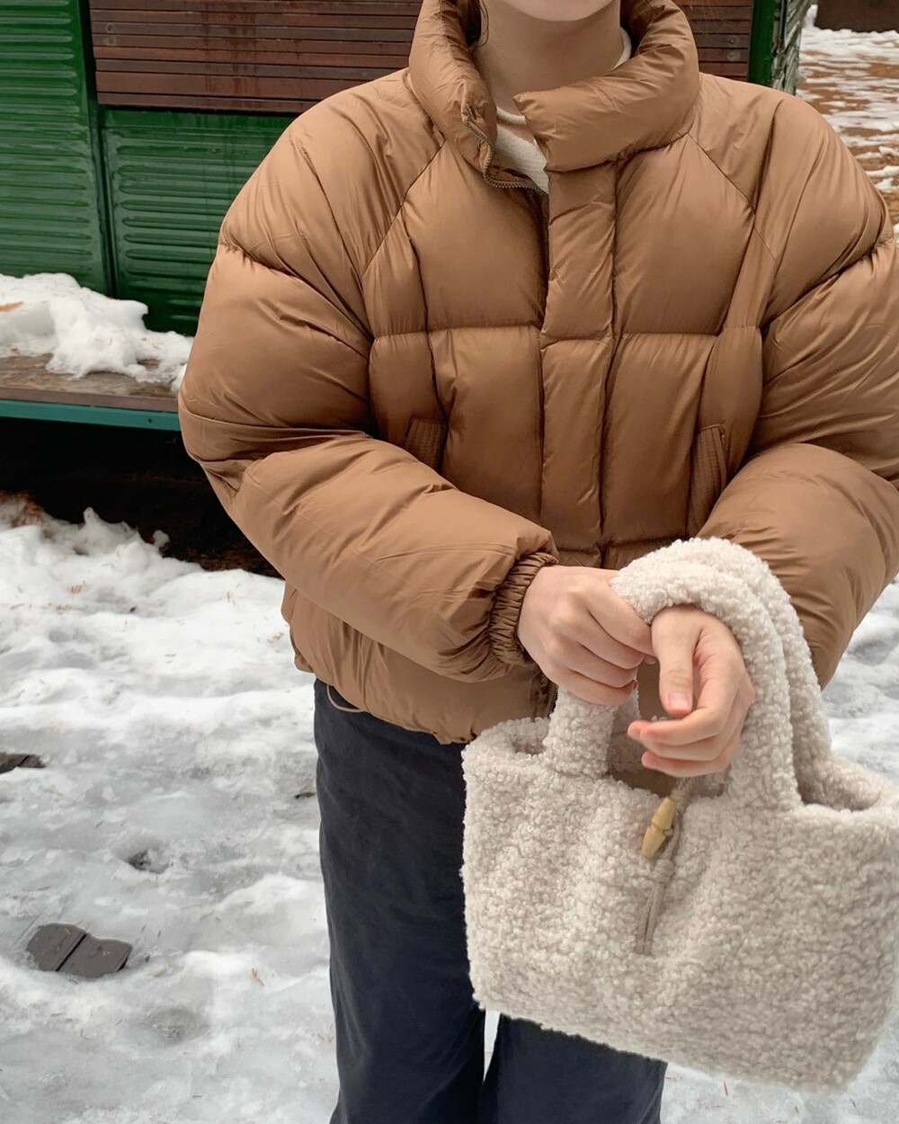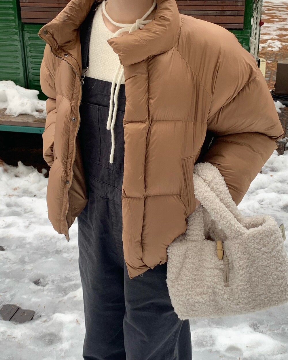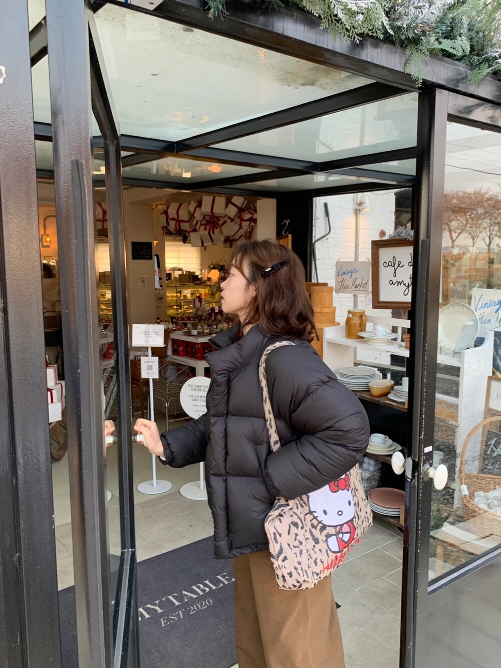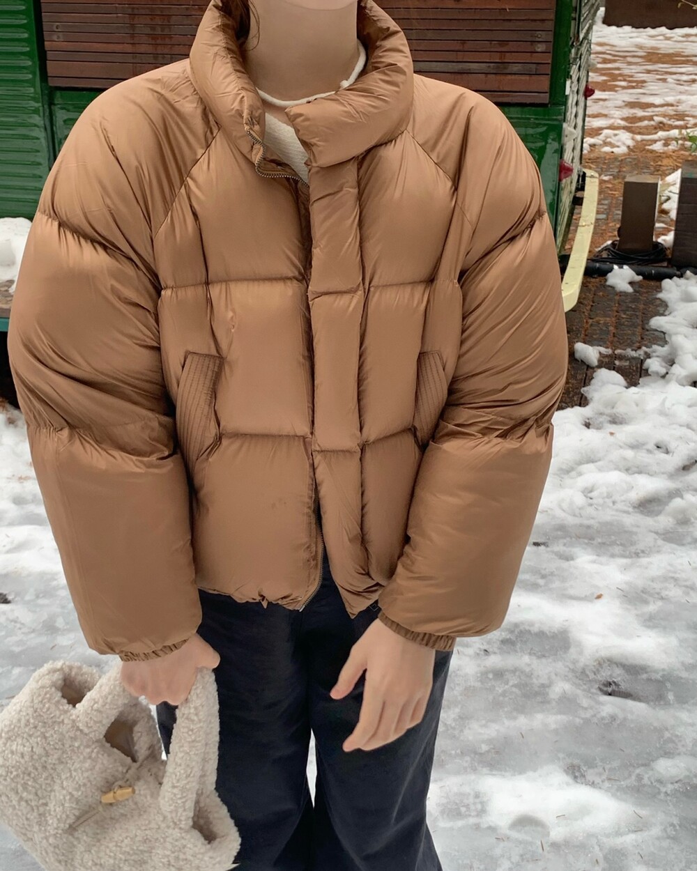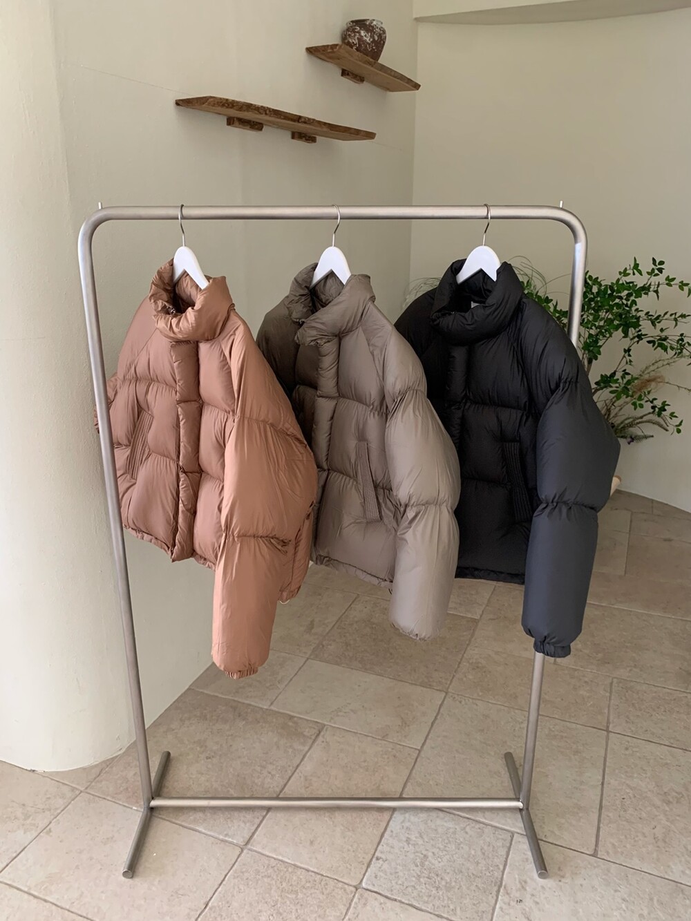 그런 제 마음을 아주 적절히 충족시킨 패딩이에요. 눈썰미 있으신 분들은 내부포켓 택 보고도 아시겠지만, 지난 *밤비 후드 패딩 과 같은 거래처에서 나온 제품이구요, 그것도 동일하게 웰론인데 정말 빵빵하고 따뜻했었죠? 아마 밤비 구매했던 분들 중에 만족하셨던 분들 계시다면 이 제품도 분명 마음에 드실거라 장담할 수 있어요 ㅎㅎ 후드 패딩에서 한층 더 담백하게! 후드도 떼고/가죽택도 떼고 깔끔+캐주얼 스타일로 나왔다 보시면 됩니다! 저는 두 제품 모두 소장하고 있지만, 확연히 다른 무드로 즐겨지는 제품들이고 확실히 이번 푸퍼 숏패딩이 더 자주 입게 되긴 하더라구요! 밤비는 귀엽고 발랄한 느낌이 느껴진다면, 요건 정말 취향 안 타고 누구나 편하게 즐기시기 좋은 스타일이에요.