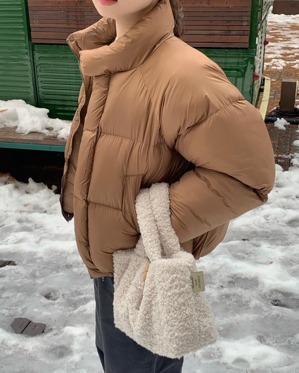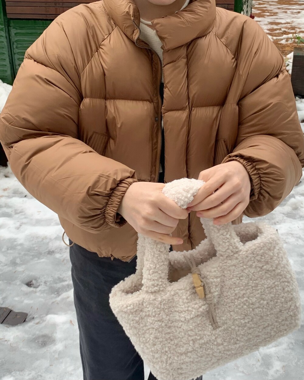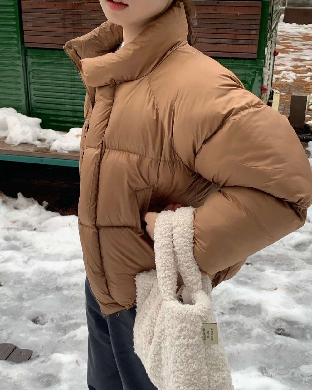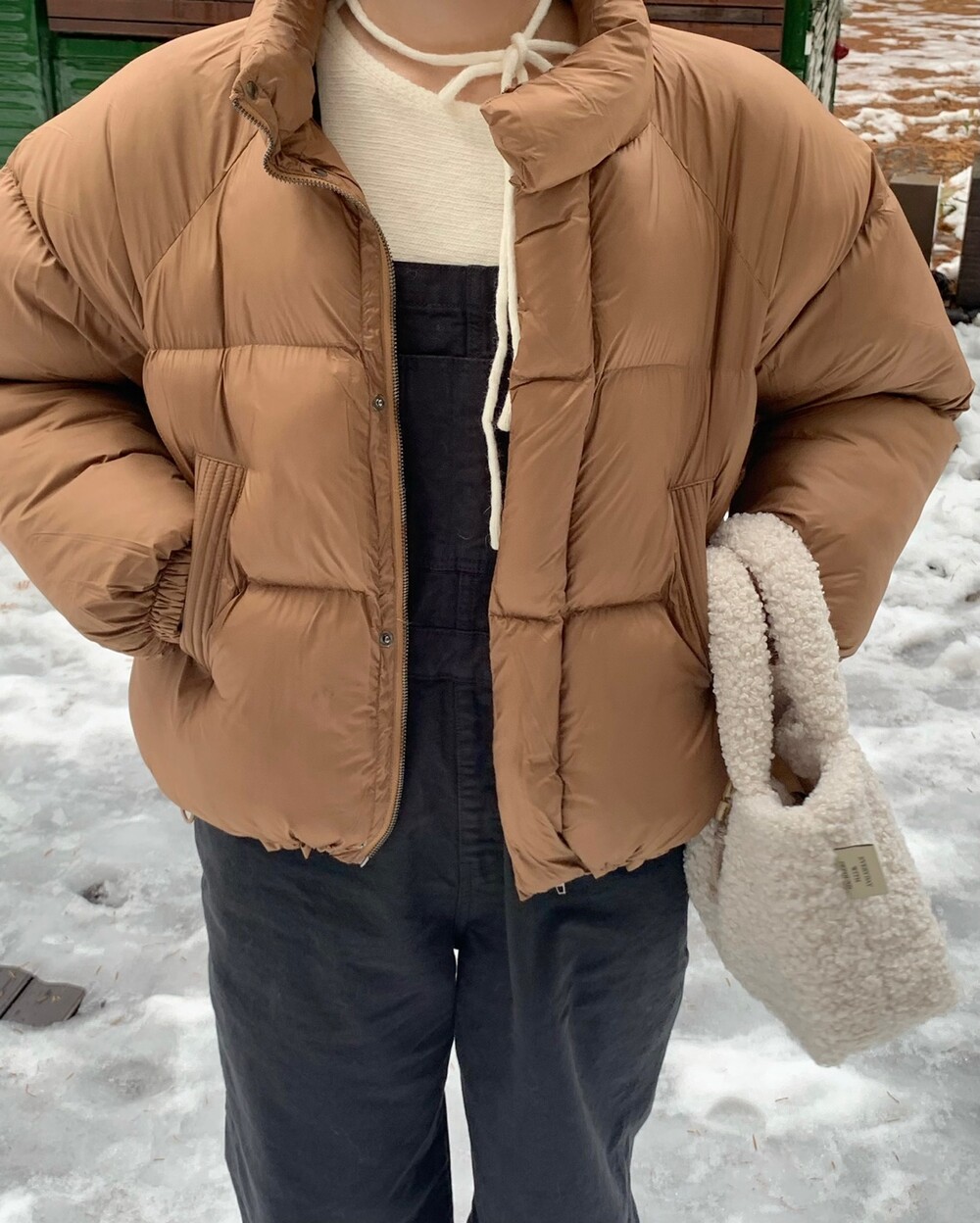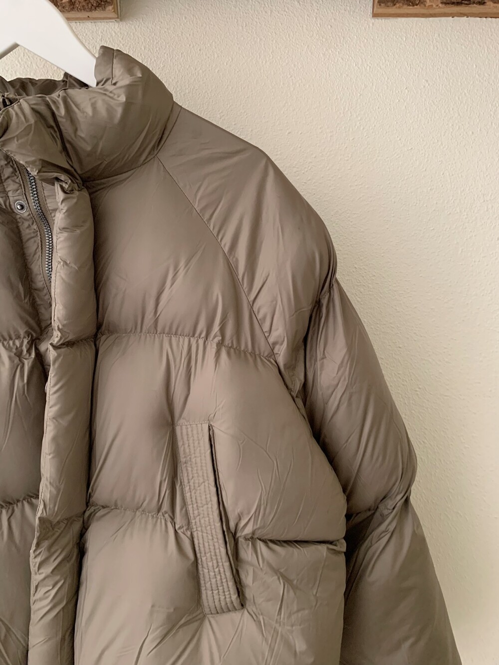 그런 제 마음을 아주 적절히 충족시킨 패딩이에요. 눈썰미 있으신 분들은 내부포켓 택 보고도 아시겠지만, 지난 *밤비 후드 패딩 과 같은 거래처에서 나온 제품이구요, 그것도 동일하게 웰론인데 정말 빵빵하고 따뜻했었죠? 아마 밤비 구매했던 분들 중에 만족하셨던 분들 계시다면 이 제품도 분명 마음에 드실거라 장담할 수 있어요 ㅎㅎ 후드 패딩에서 한층 더 담백하게! 후드도 떼고/가죽택도 떼고 깔끔+캐주얼 스타일로 나왔다 보시면 됩니다! 저는 두 제품 모두 소장하고 있지만, 확연히 다른 무드로 즐겨지는 제품들이고 확실히 이번 푸퍼 숏패딩이 더 자주 입게 되긴 하더라구요! 밤비는 귀엽고 발랄한 느낌이 느껴진다면, 요건 정말 취향 안 타고 누구나 편하게 즐기시기 좋은 스타일이에요.