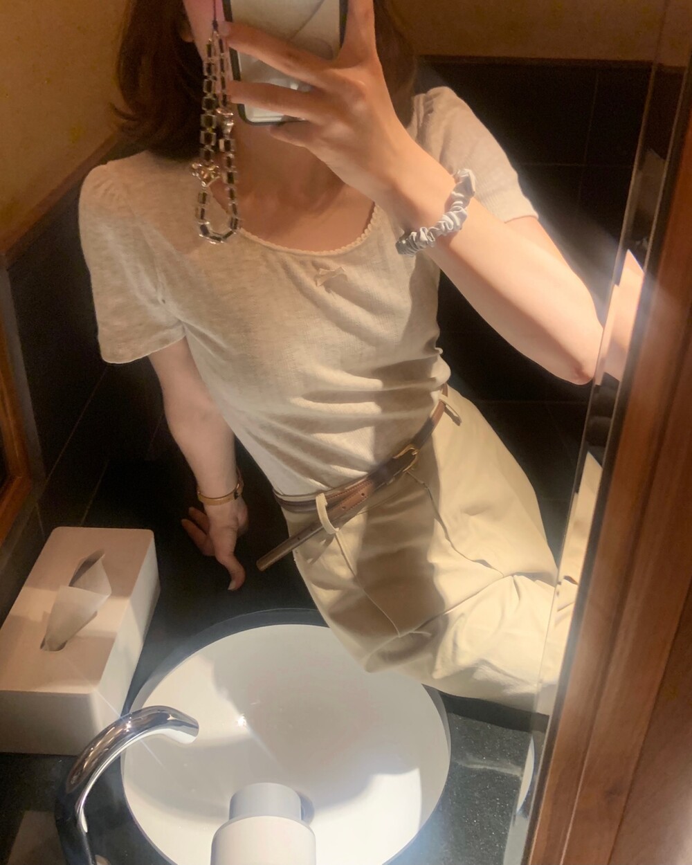 적당한 상의 기장에 요 심볼이 보이도록 매치해주면 걸을때마다