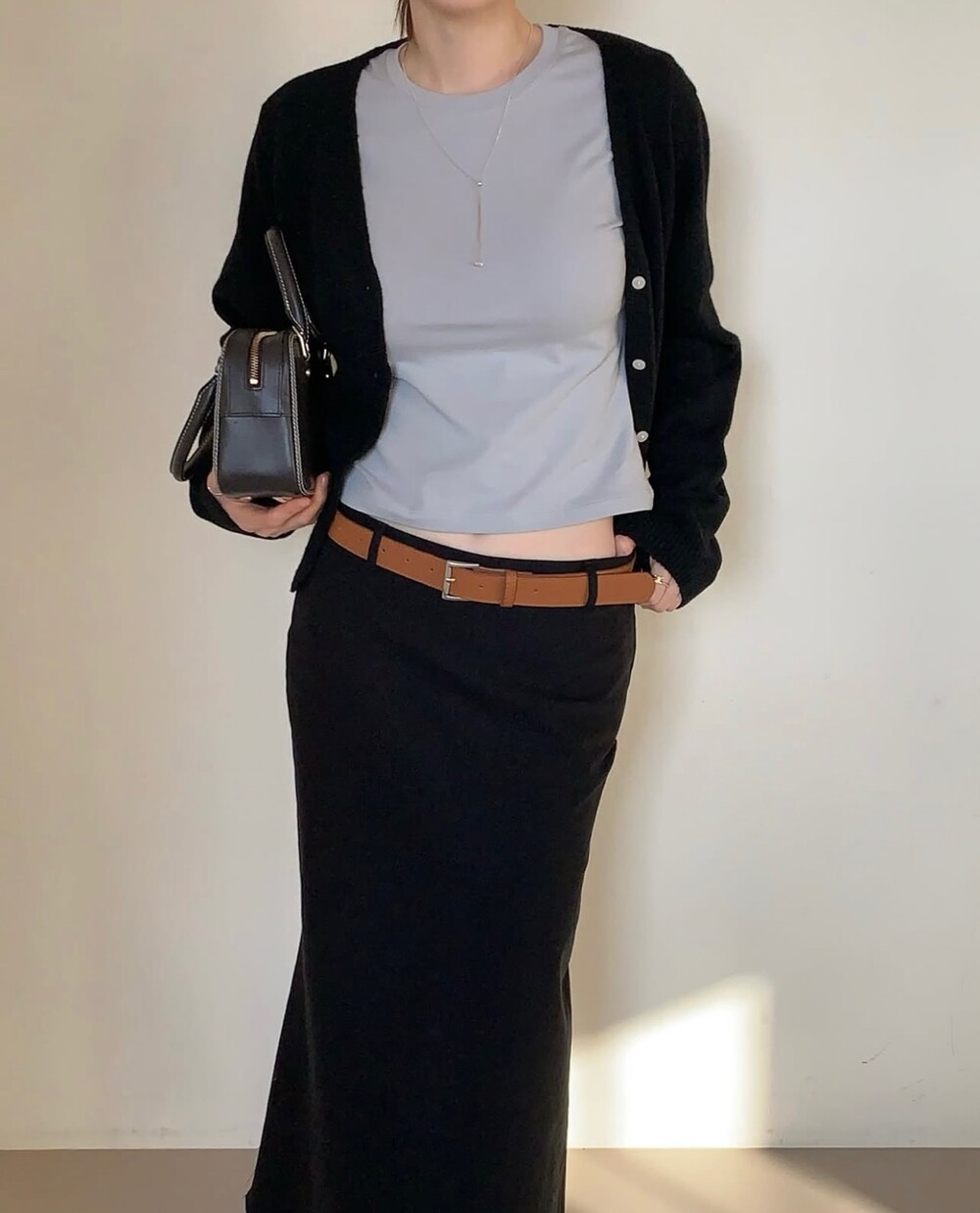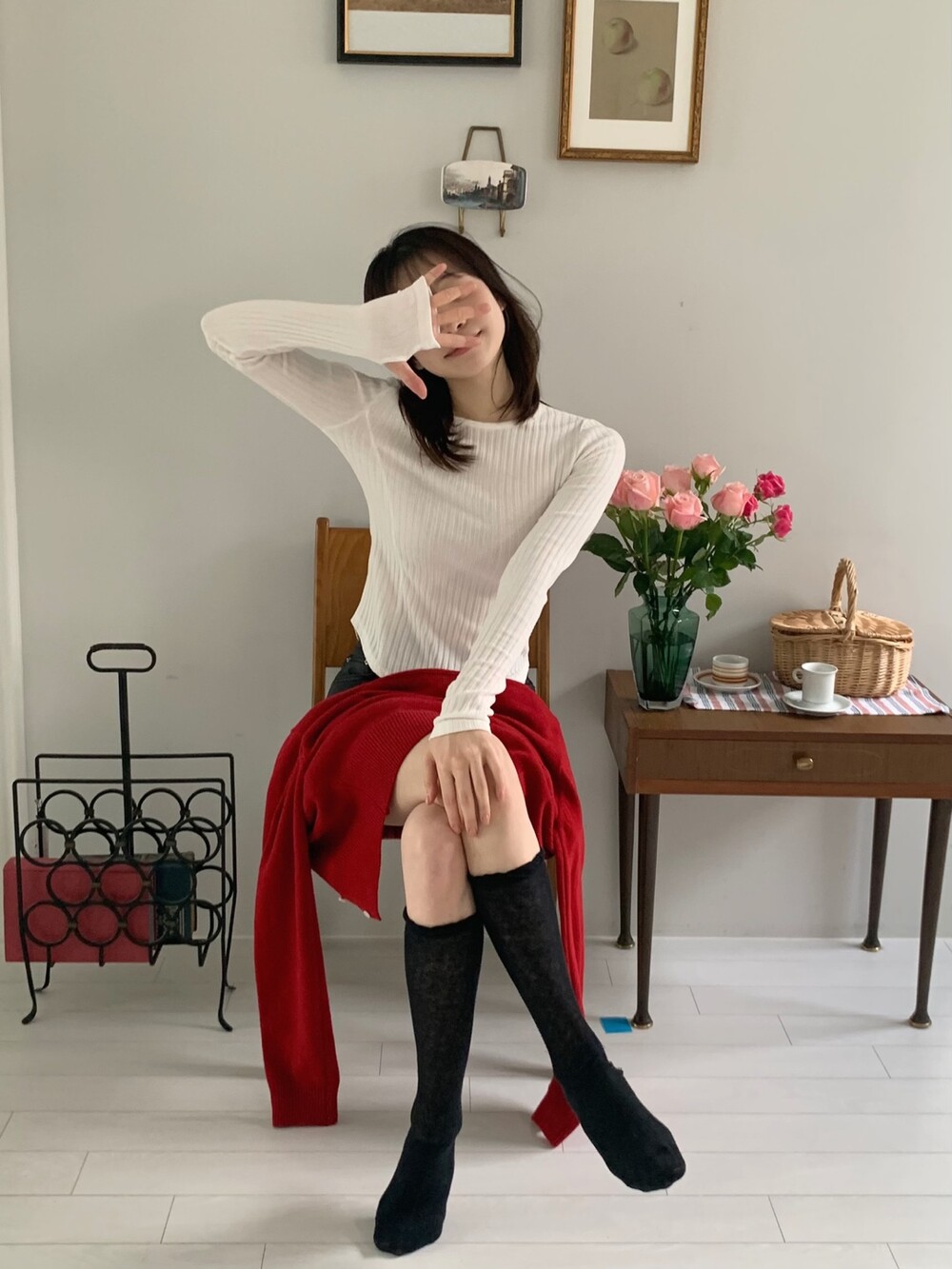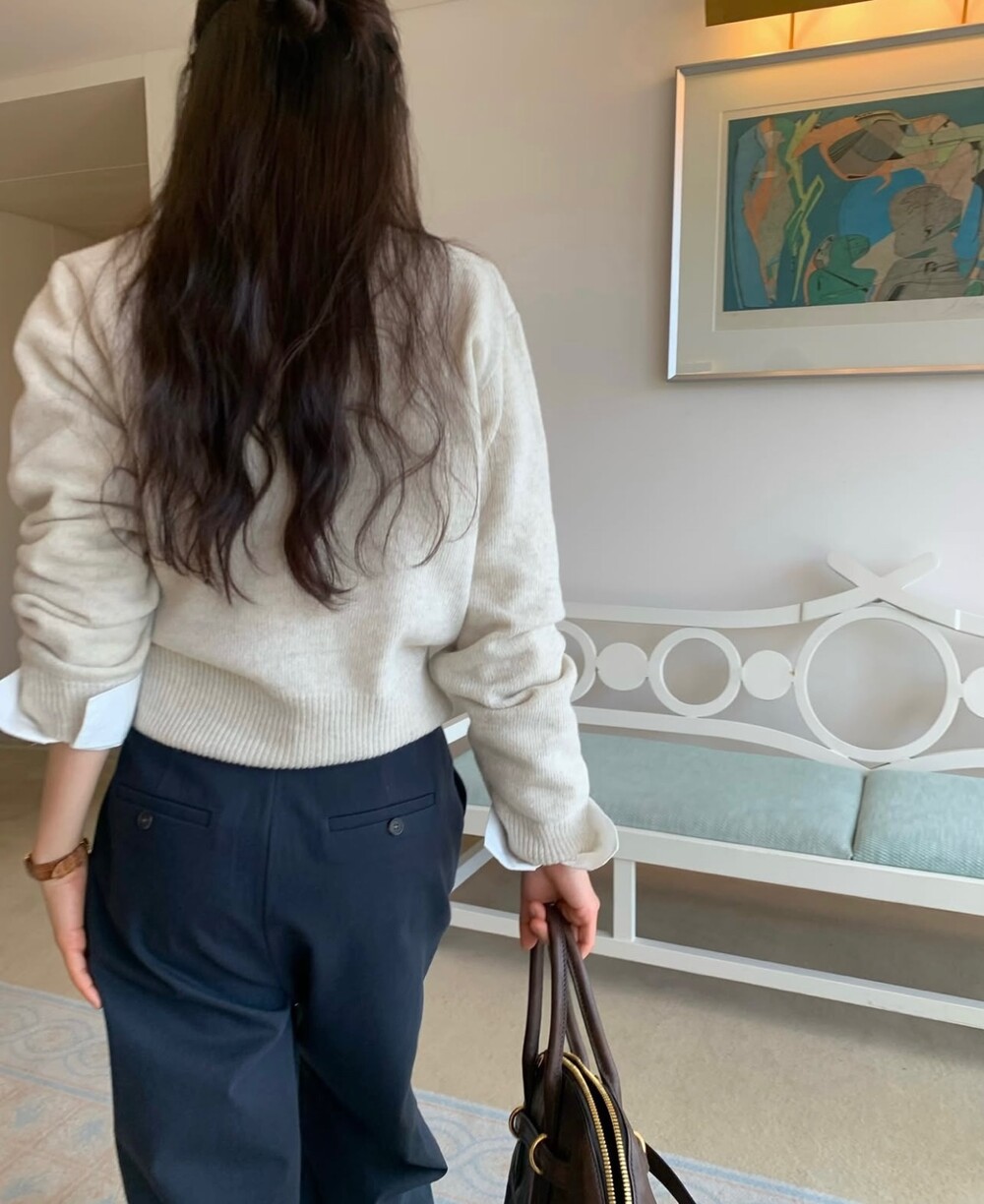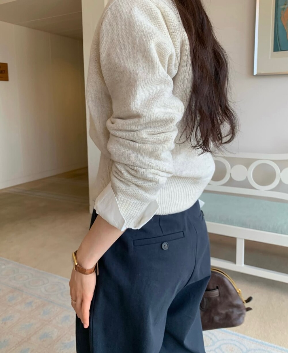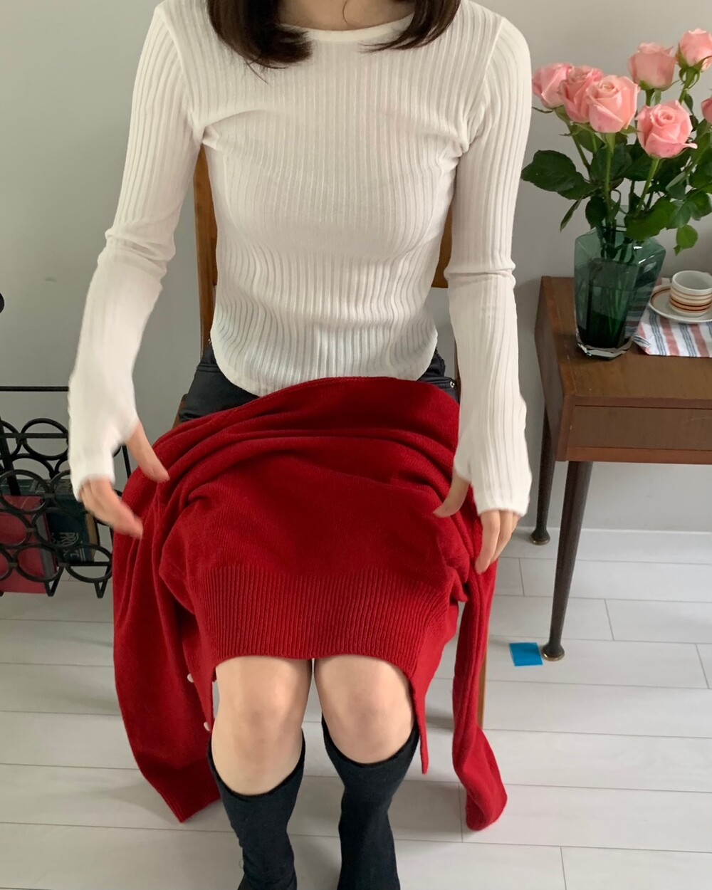 핏되는 느낌으로 착용되는 제품이었어요. 넥라인도 브이넥으로 떨어지면서