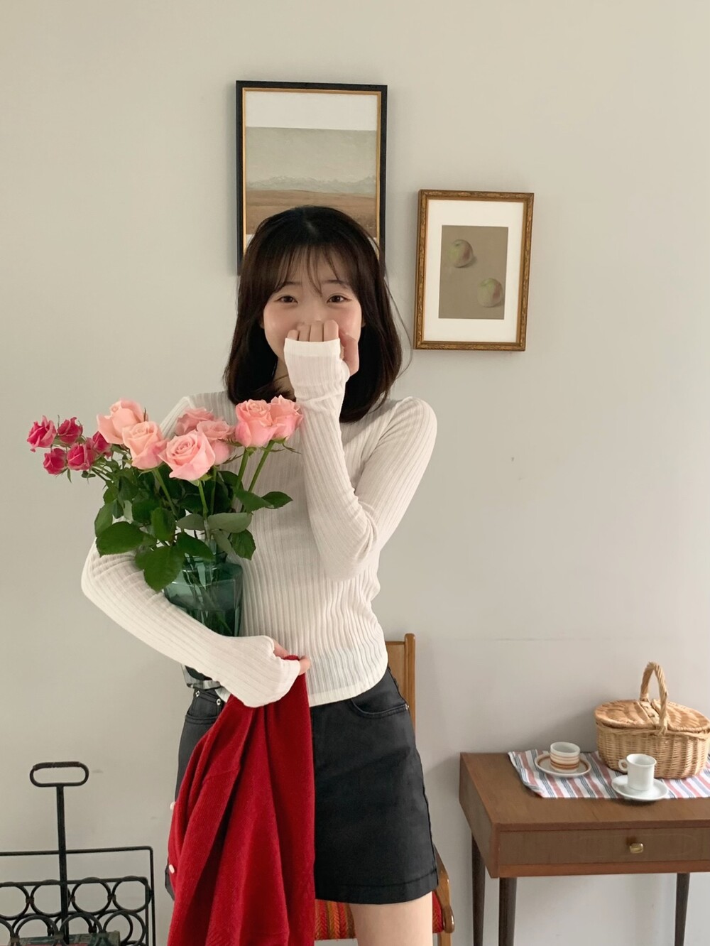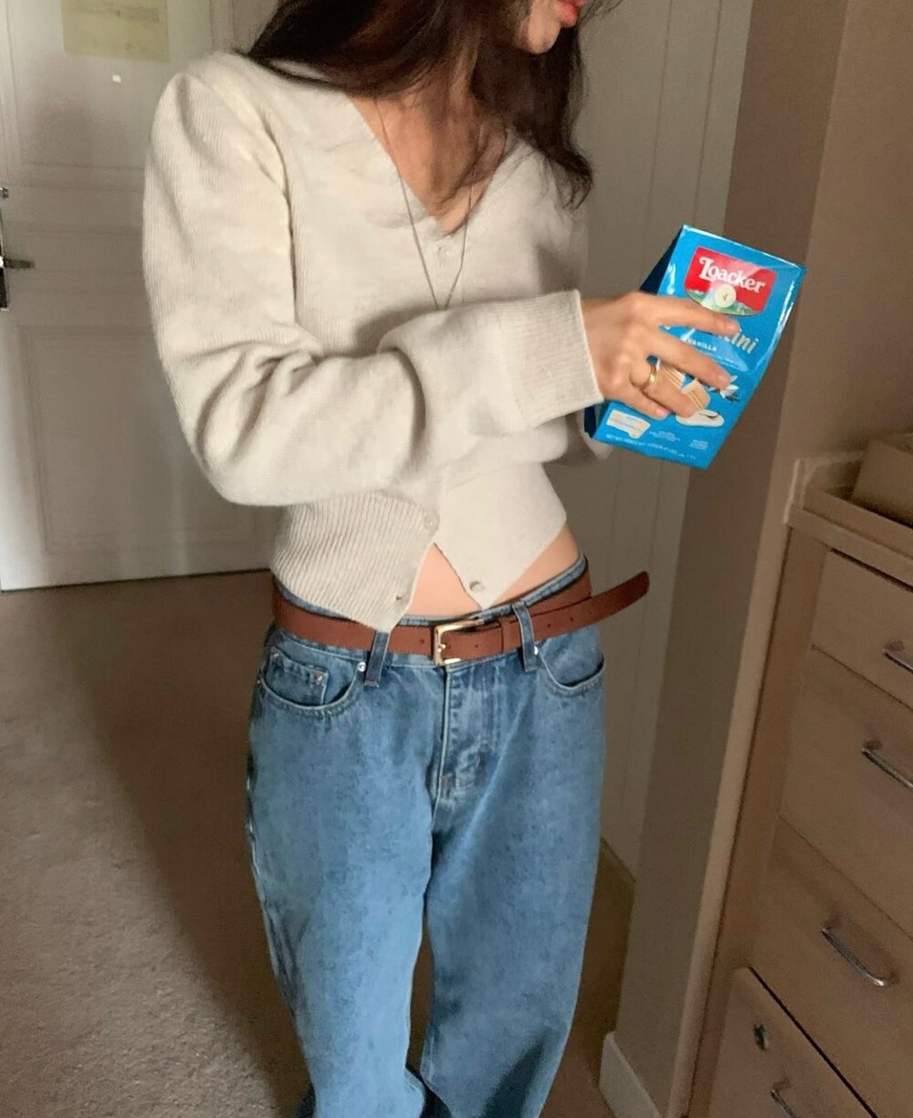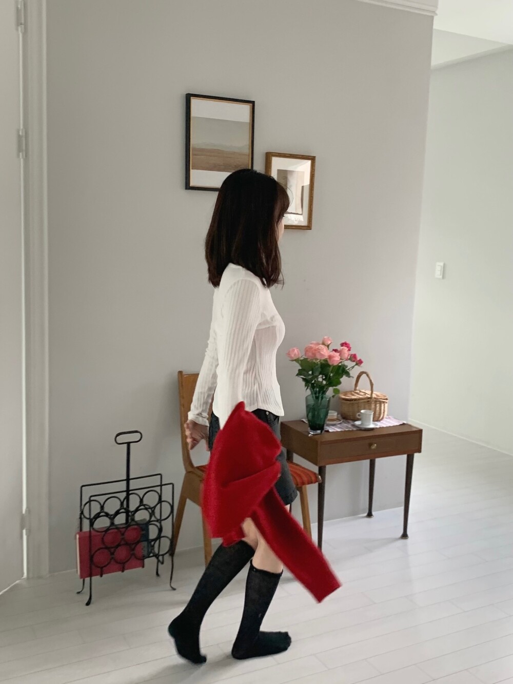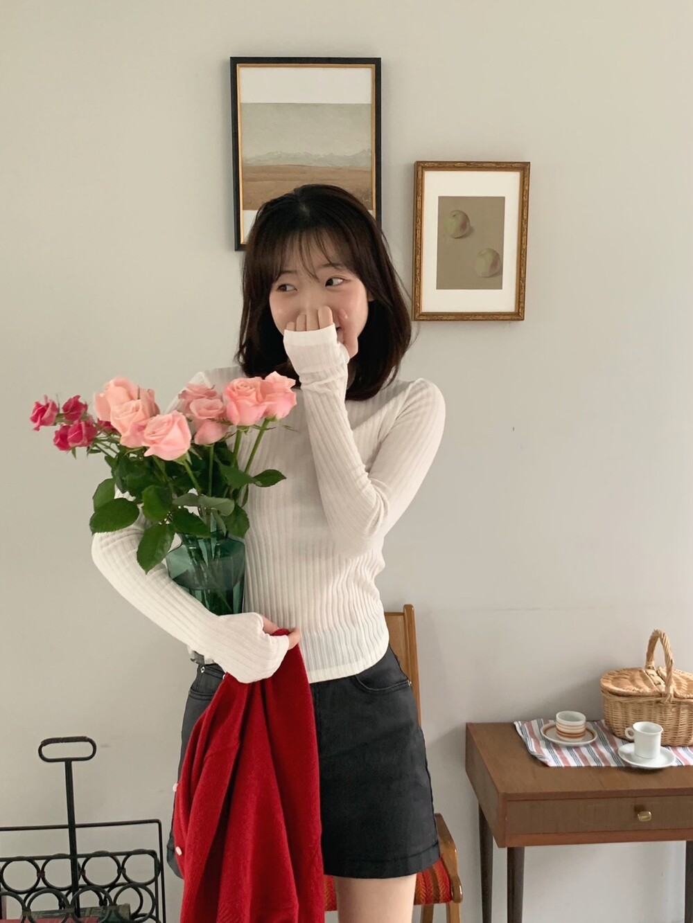 핏되는 느낌으로 착용되는 제품이었어요. 넥라인도 브이넥으로 떨어지면서