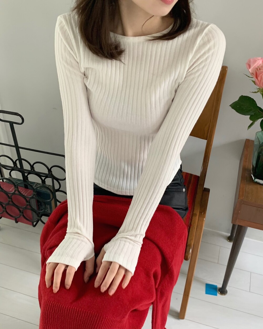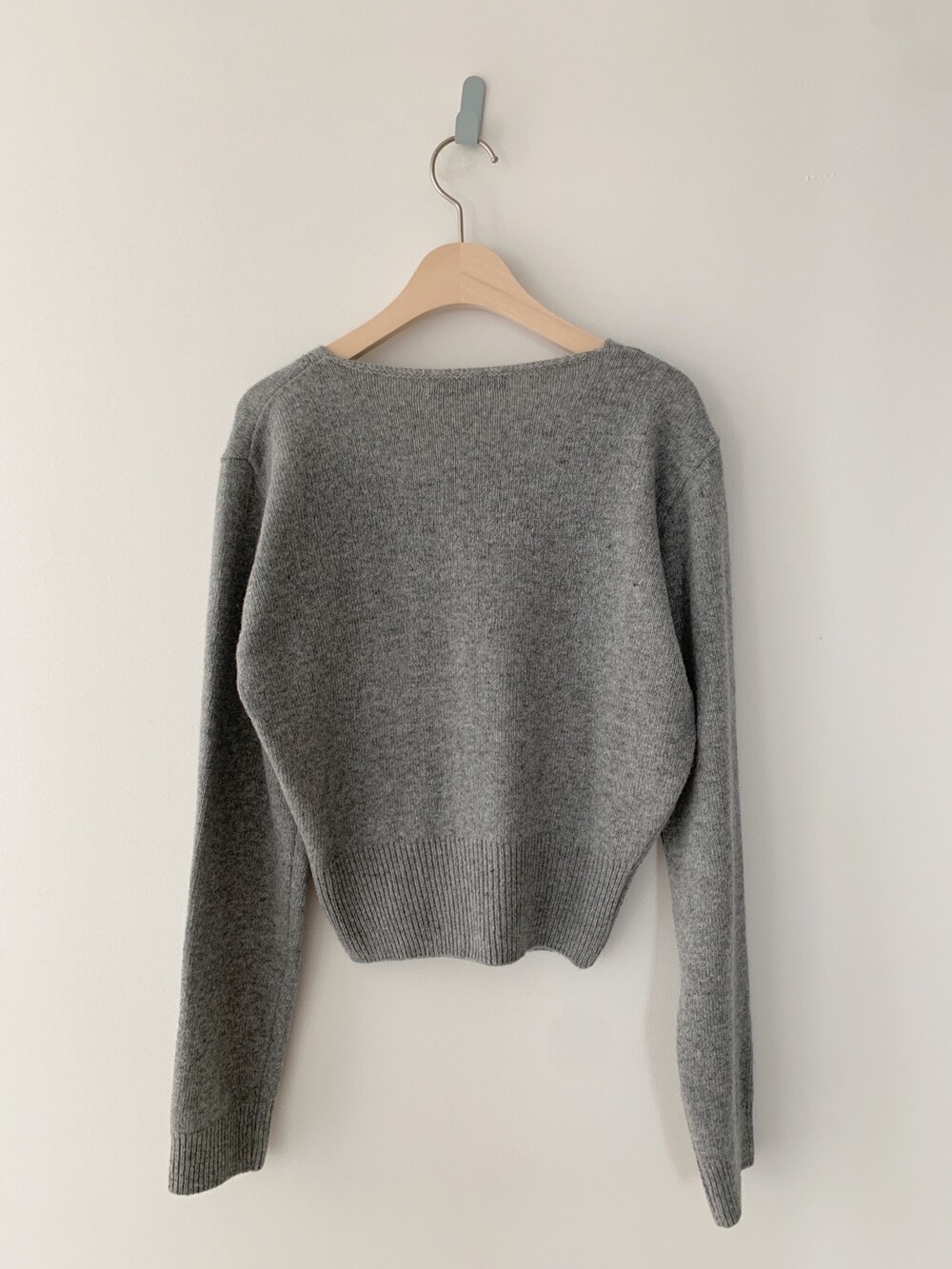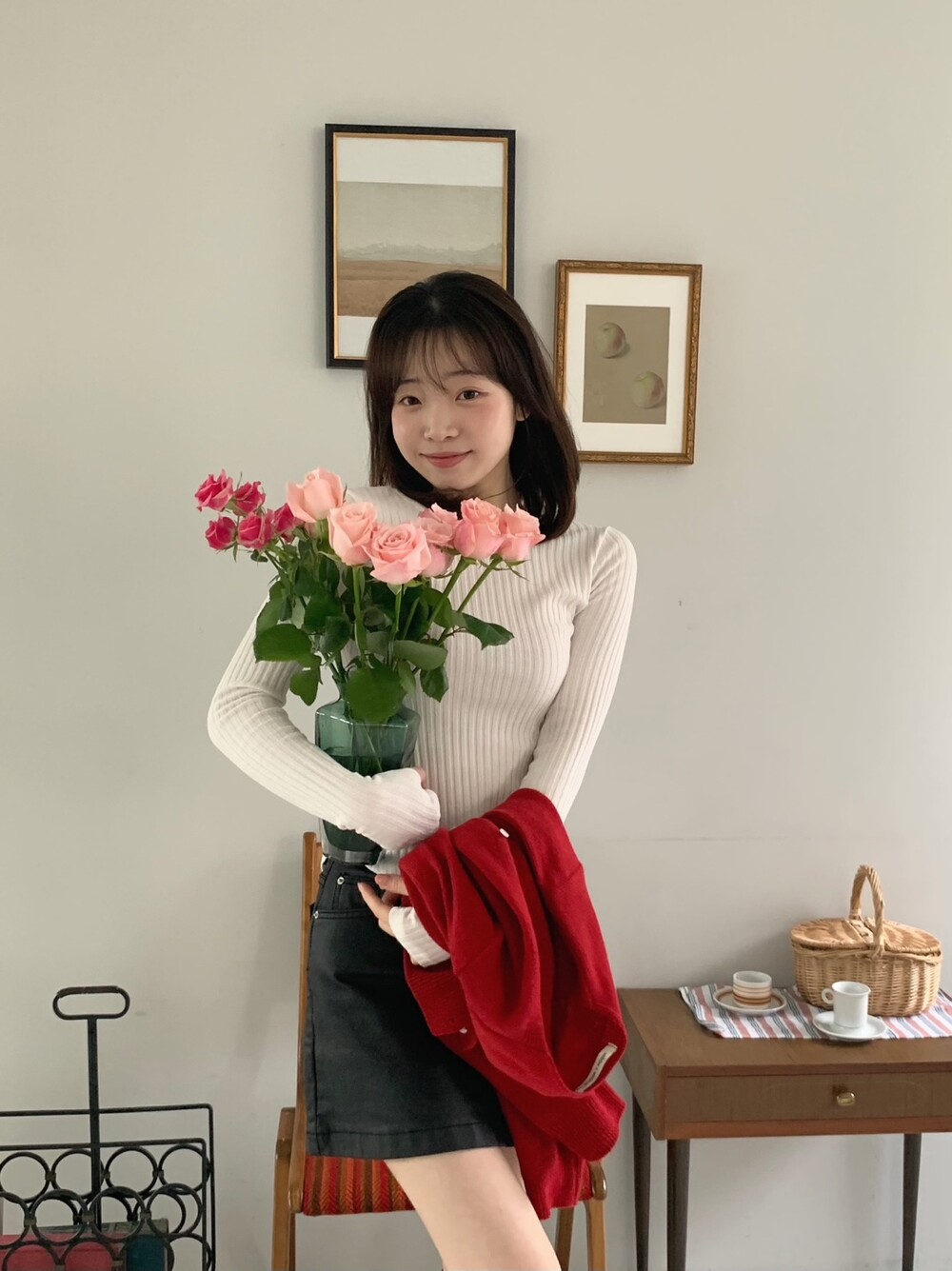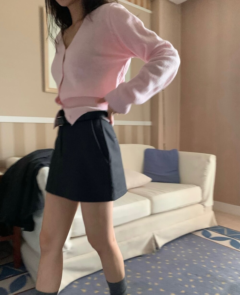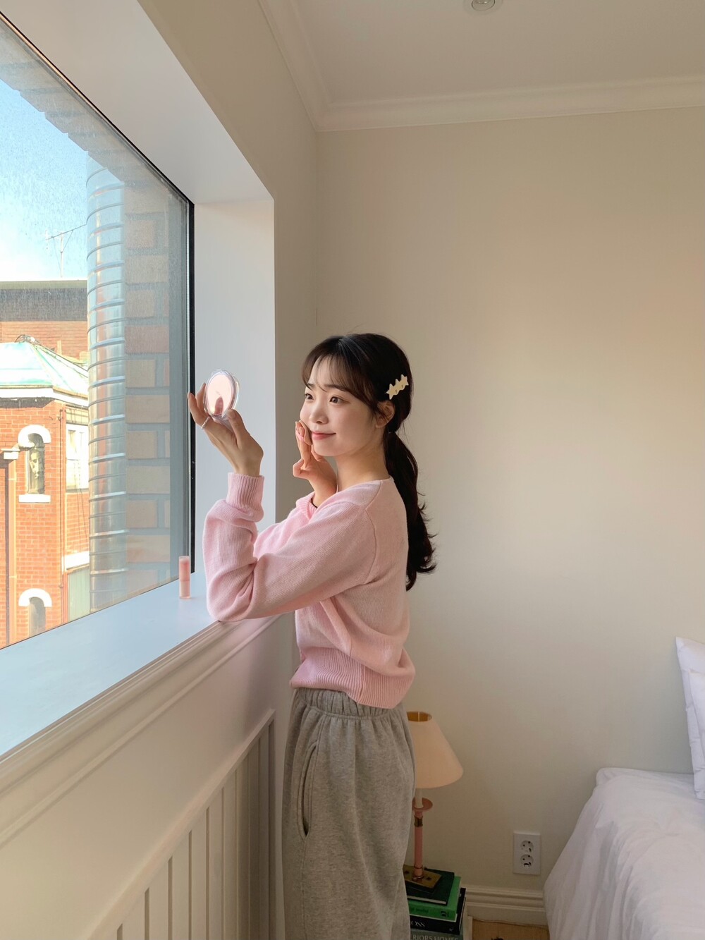 핏되는 느낌으로 착용되는 제품이었어요. 넥라인도 브이넥으로 떨어지면서