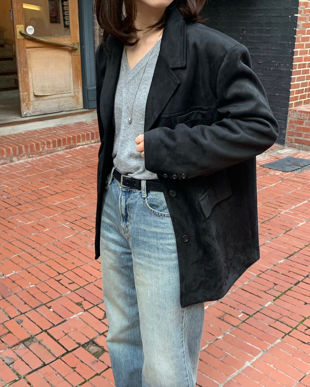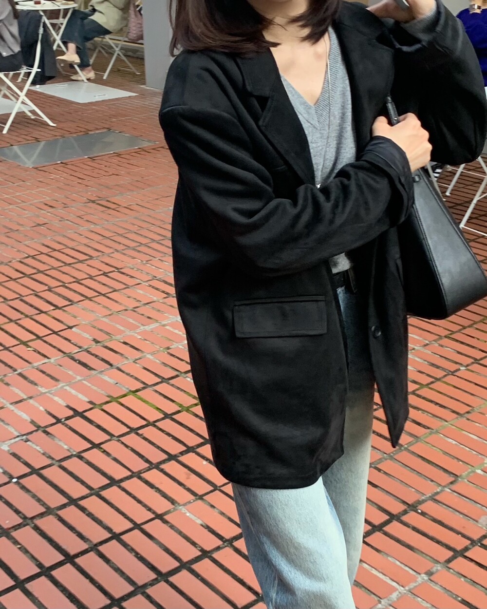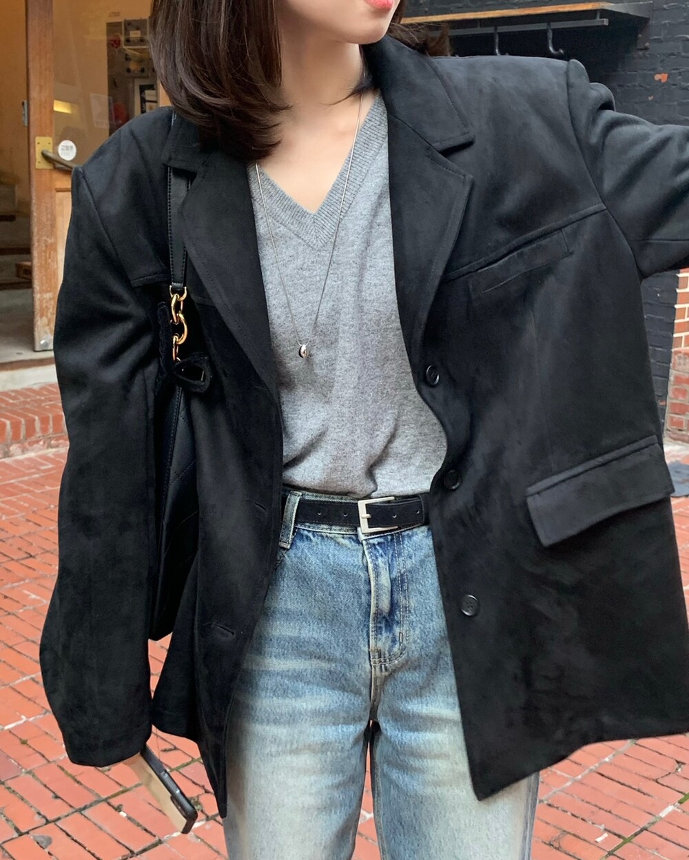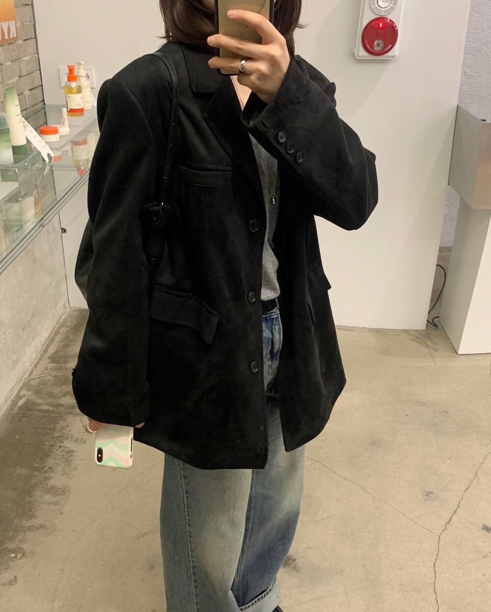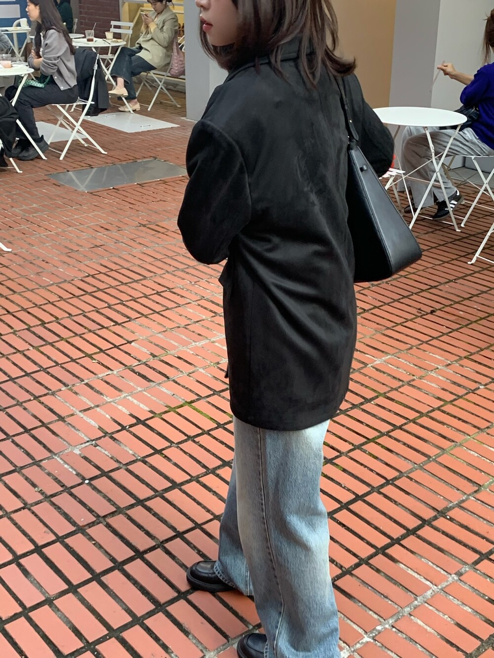 요즘 느낌 좋은 언니들이라면 하나쯤은 가지고 있는 아이템인데요 ㅎㅎ 스웨이드 자켓을 구매할 때 가장 따져보고 구매하셔야 할 제품이 바로 재질입니다! ☆혼용률이 아닌 정말 눈으로,손으로 느껴지는 텍스처요☆ 물론 실패 없는 구매를 위해서 제가 대신 꼼꼼히 따져서 셀렉해 온 제품이기도 한데요ㅎㅎ 재질이 자칫 빳빳하거나, 인위적인 광이 도는게 눈에 보이는 순간! 싼티 나 보이는 자켓 되기 쉽상이거든요? 그만큼 스웨이드 제품은 원단이 가장 중요하답니다! 이 제품은 광택감이 돌지 않고 손끝으로도 느껴지는 부드럽고 유연한 감촉이 정말 장점이에요. 매끄러운 원단 덕분에 착용했을 때 몸에 자연스럽게 흐르는 핏이 두배로 멋스러운 분위기를 이끌어내주더라구요 ♡