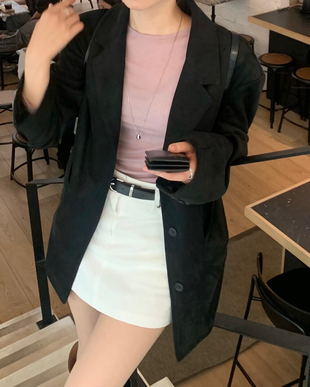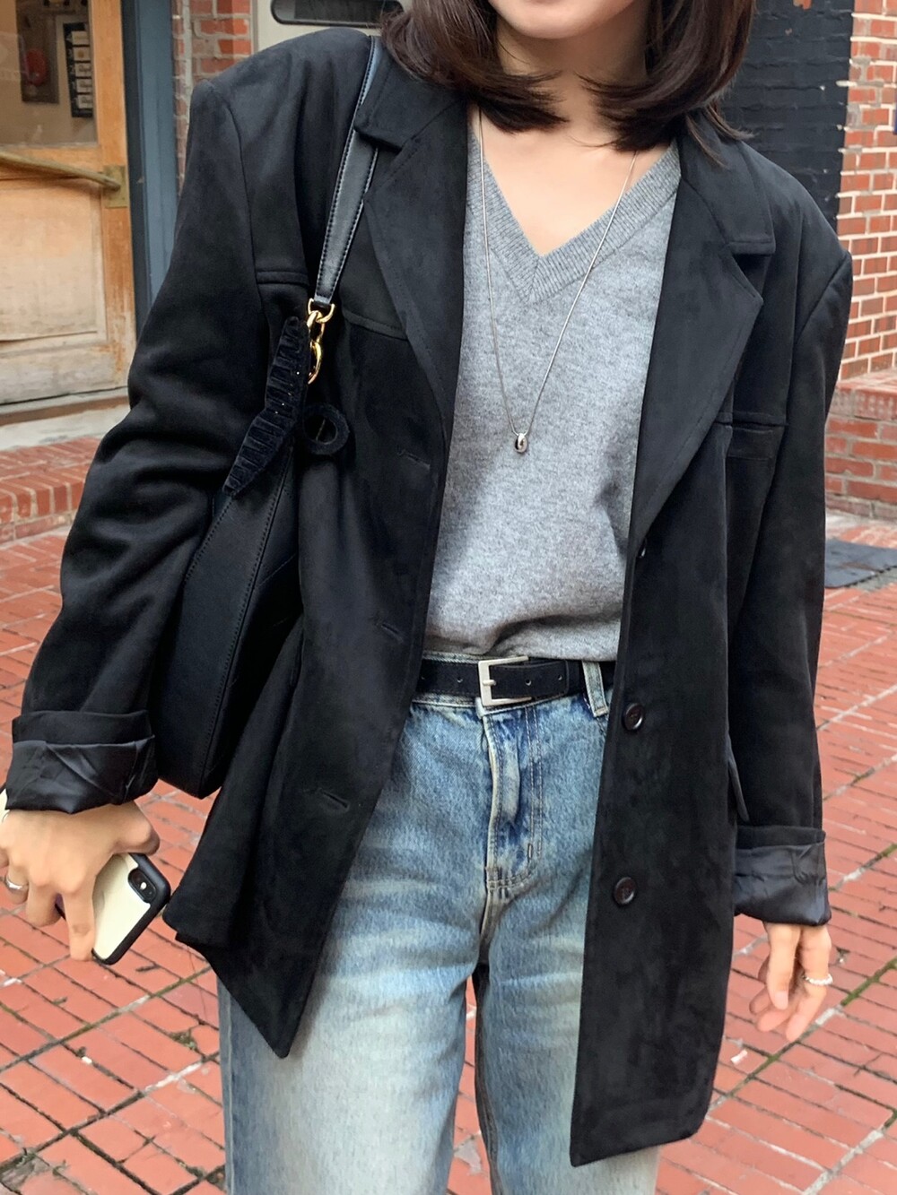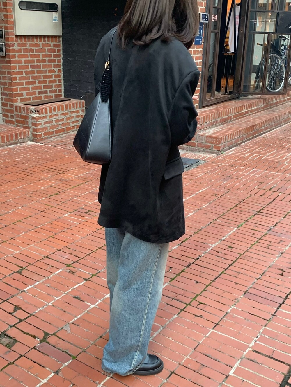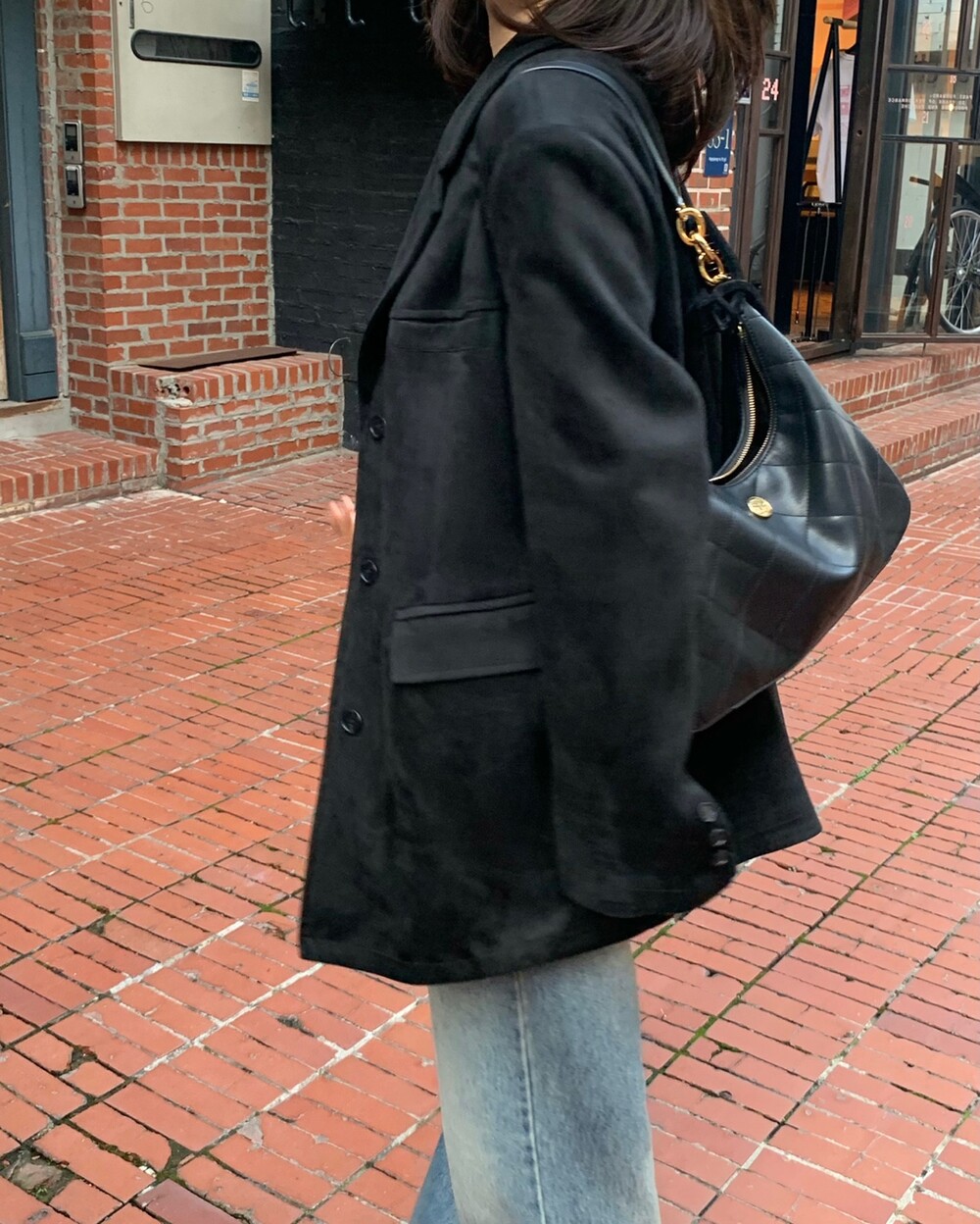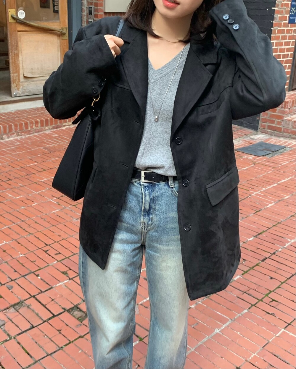 요즘 느낌 좋은 언니들이라면 하나쯤은 가지고 있는 아이템인데요 ㅎㅎ 스웨이드 자켓을 구매할 때 가장 따져보고 구매하셔야 할 제품이 바로 재질입니다! ☆혼용률이 아닌 정말 눈으로,손으로 느껴지는 텍스처요☆ 물론 실패 없는 구매를 위해서 제가 대신 꼼꼼히 따져서 셀렉해 온 제품이기도 한데요ㅎㅎ 재질이 자칫 빳빳하거나, 인위적인 광이 도는게 눈에 보이는 순간! 싼티 나 보이는 자켓 되기 쉽상이거든요? 그만큼 스웨이드 제품은 원단이 가장 중요하답니다! 이 제품은 광택감이 돌지 않고 손끝으로도 느껴지는 부드럽고 유연한 감촉이 정말 장점이에요. 매끄러운 원단 덕분에 착용했을 때 몸에 자연스럽게 흐르는 핏이 두배로 멋스러운 분위기를 이끌어내주더라구요 ♡
