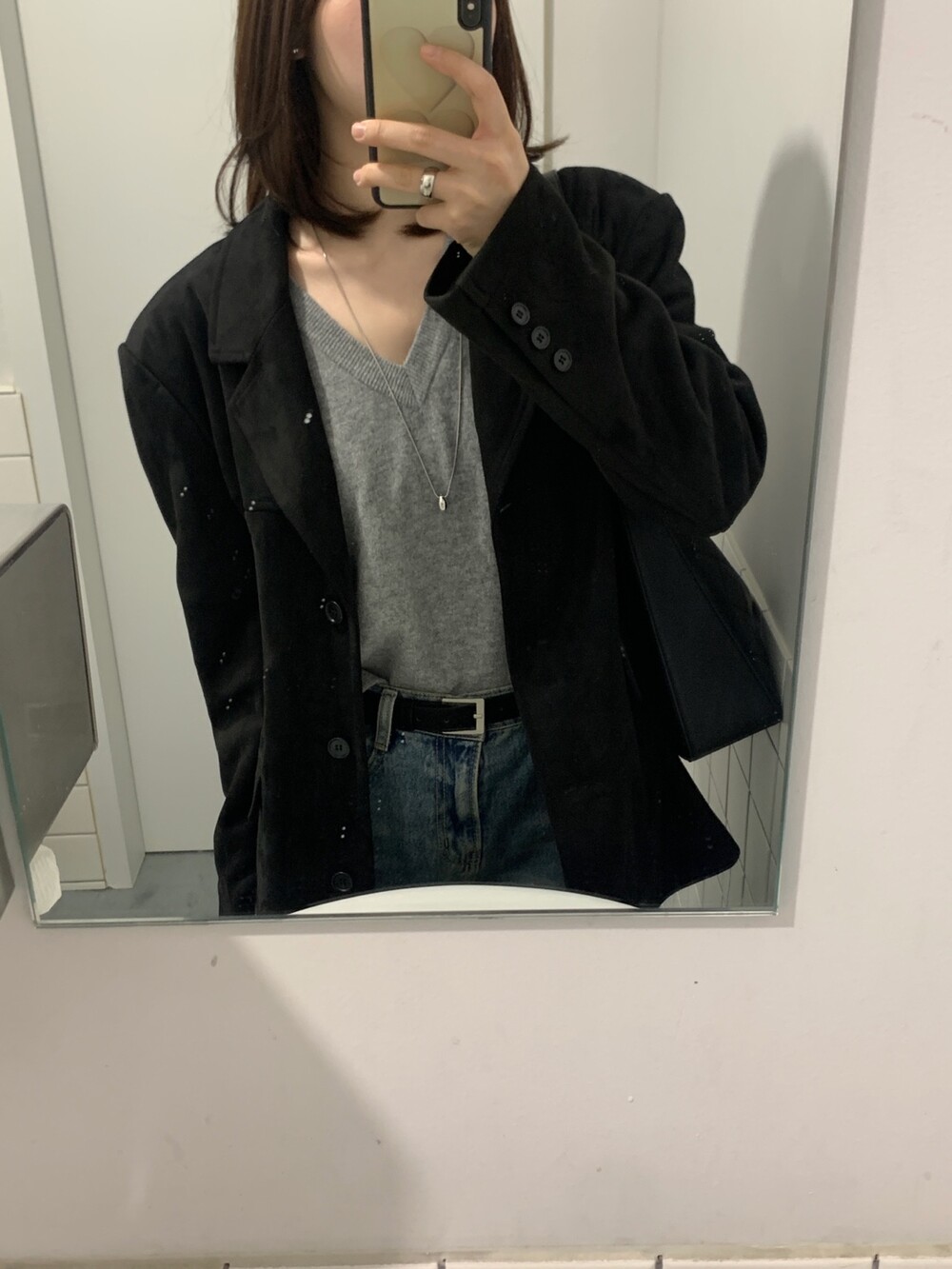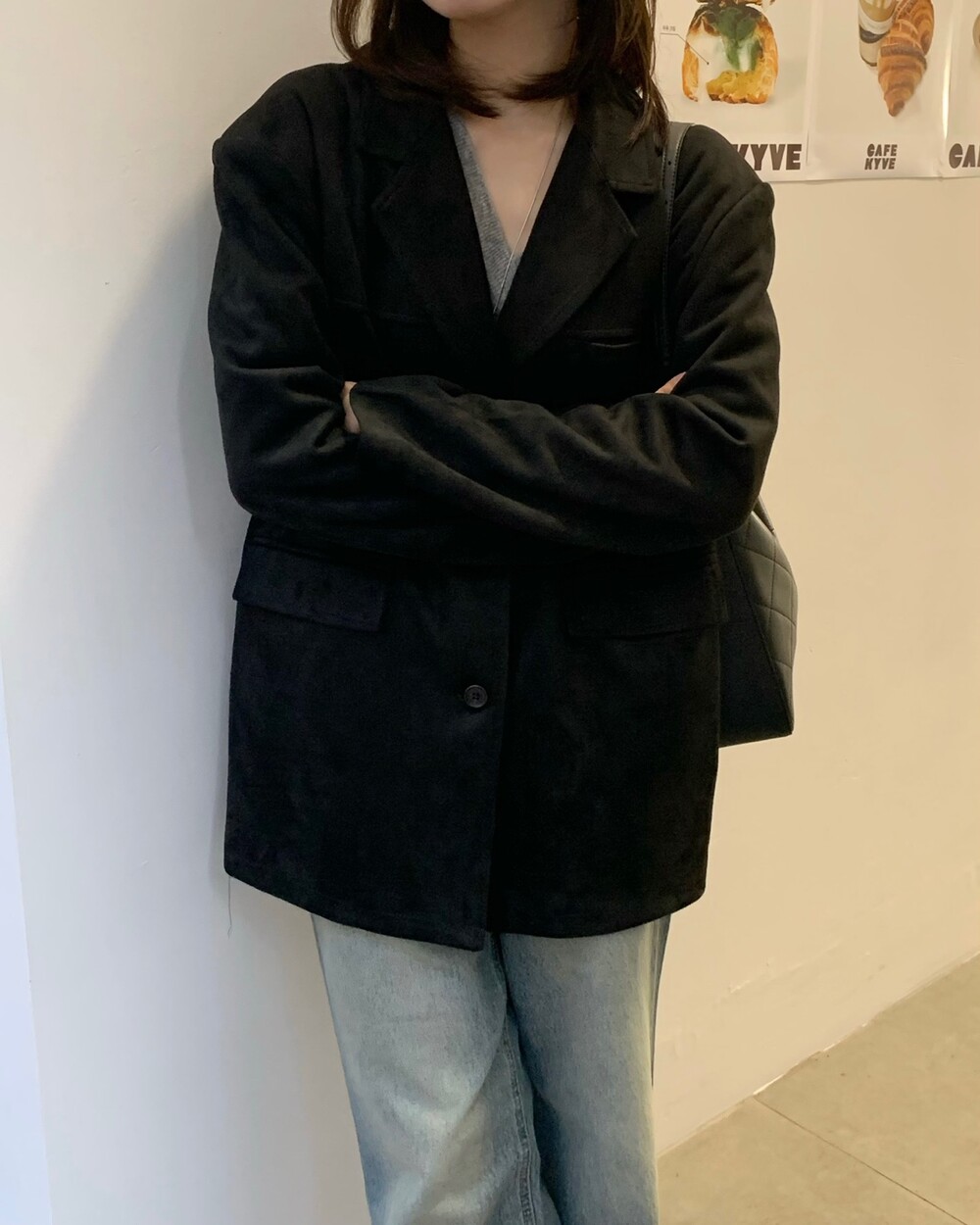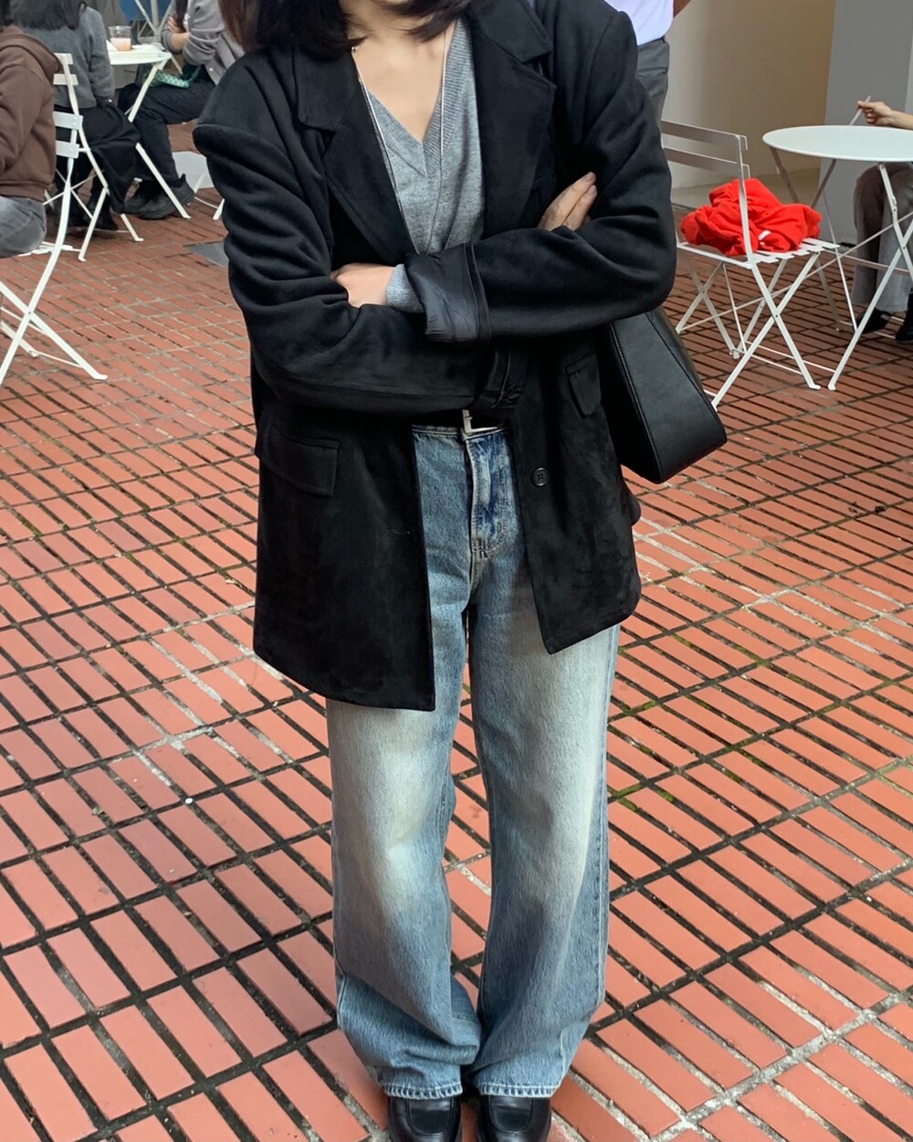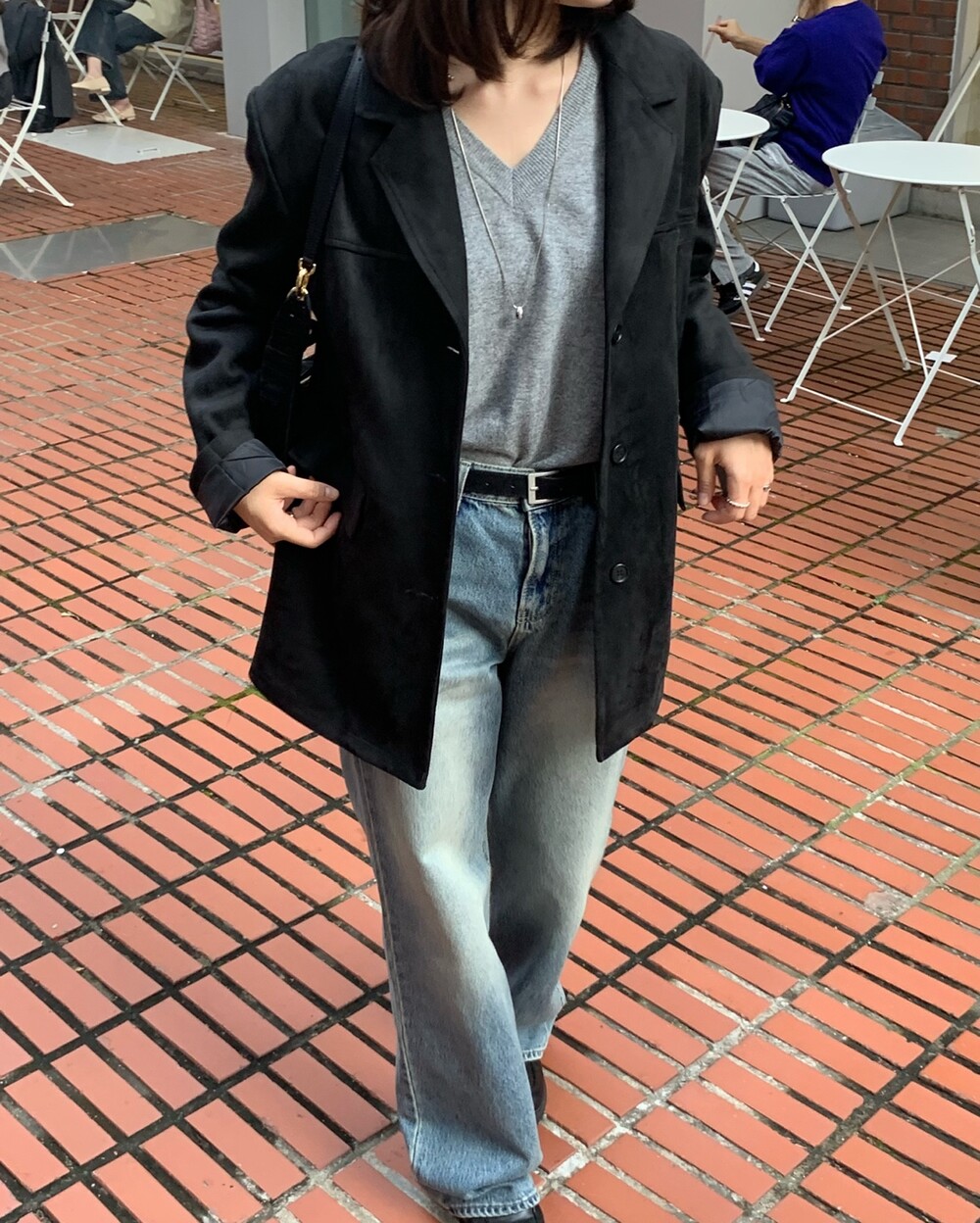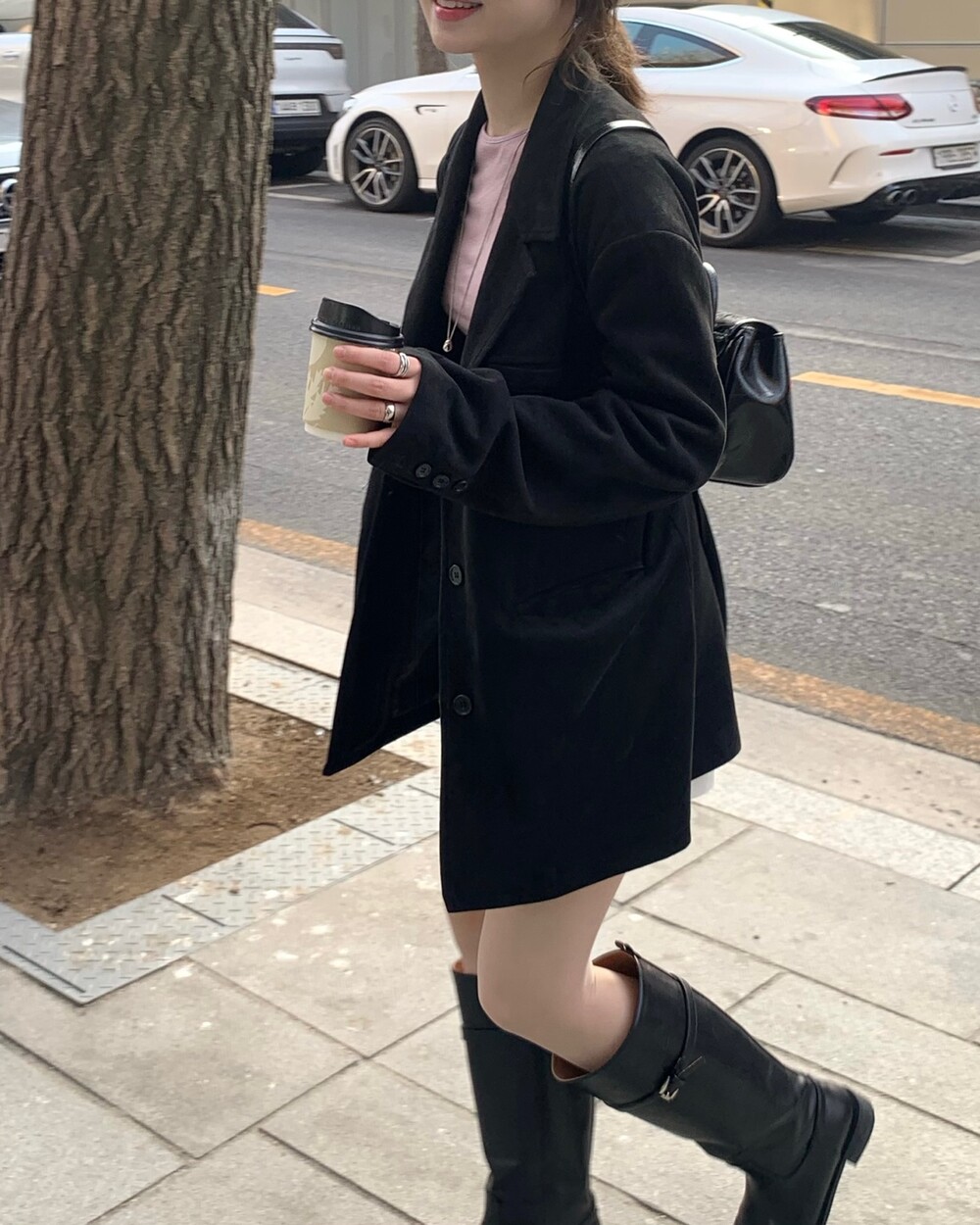 요즘 느낌 좋은 언니들이라면 하나쯤은 가지고 있는 아이템인데요 ㅎㅎ 스웨이드 자켓을 구매할 때 가장 따져보고 구매하셔야 할 제품이 바로 재질입니다! ☆혼용률이 아닌 정말 눈으로,손으로 느껴지는 텍스처요☆ 물론 실패 없는 구매를 위해서 제가 대신 꼼꼼히 따져서 셀렉해 온 제품이기도 한데요ㅎㅎ 재질이 자칫 빳빳하거나, 인위적인 광이 도는게 눈에 보이는 순간! 싼티 나 보이는 자켓 되기 쉽상이거든요? 그만큼 스웨이드 제품은 원단이 가장 중요하답니다! 이 제품은 광택감이 돌지 않고 손끝으로도 느껴지는 부드럽고 유연한 감촉이 정말 장점이에요. 매끄러운 원단 덕분에 착용했을 때 몸에 자연스럽게 흐르는 핏이 두배로 멋스러운 분위기를 이끌어내주더라구요 ♡