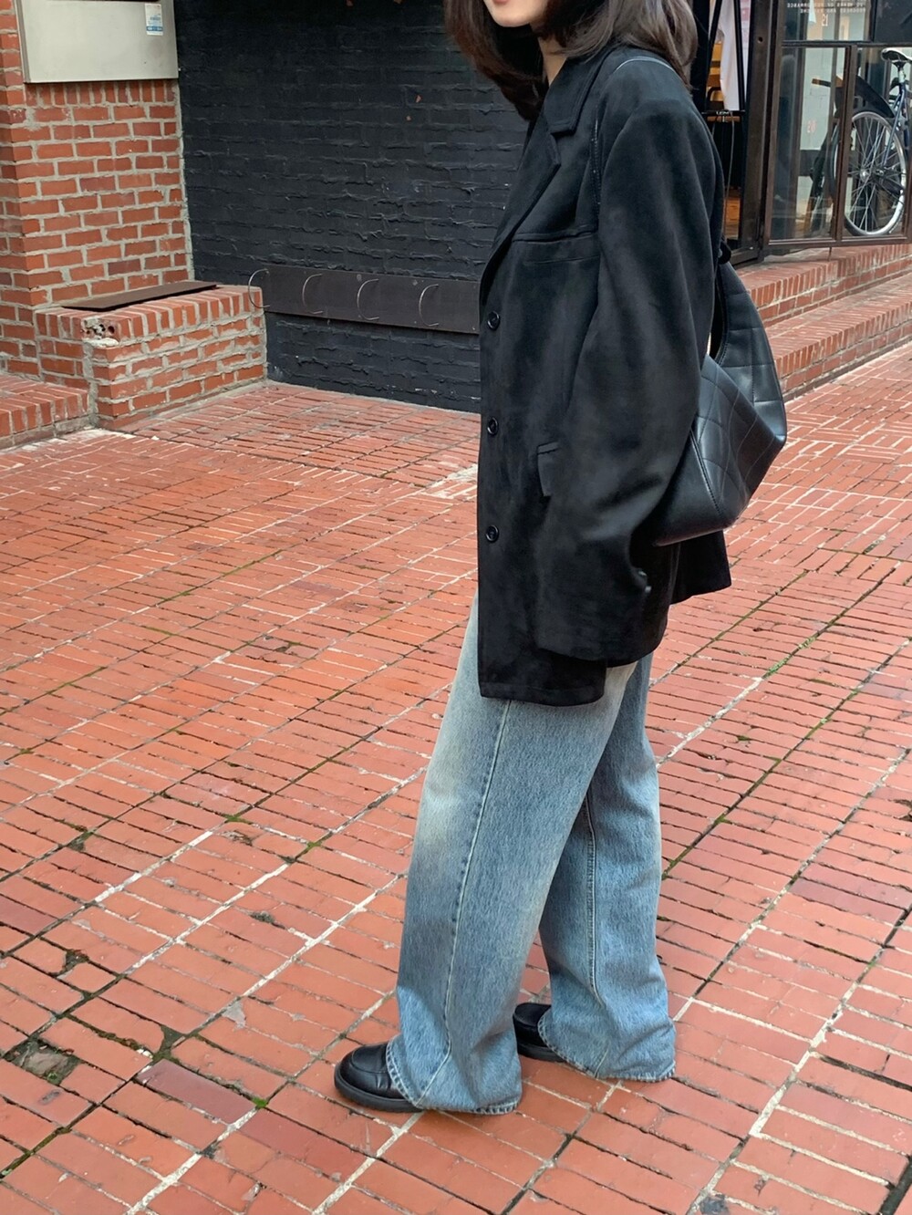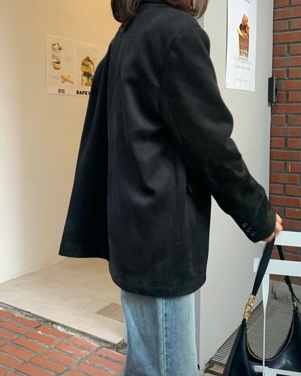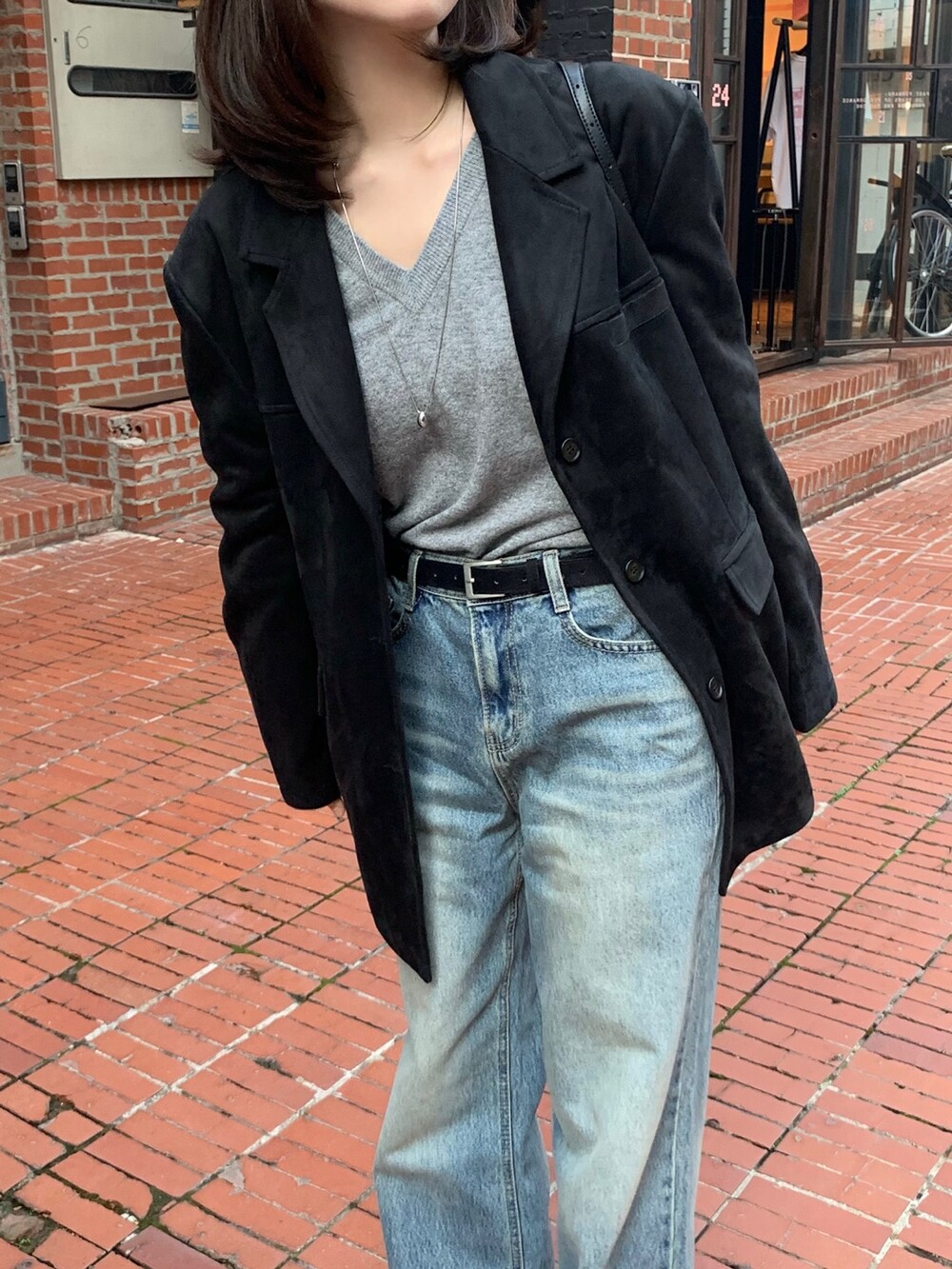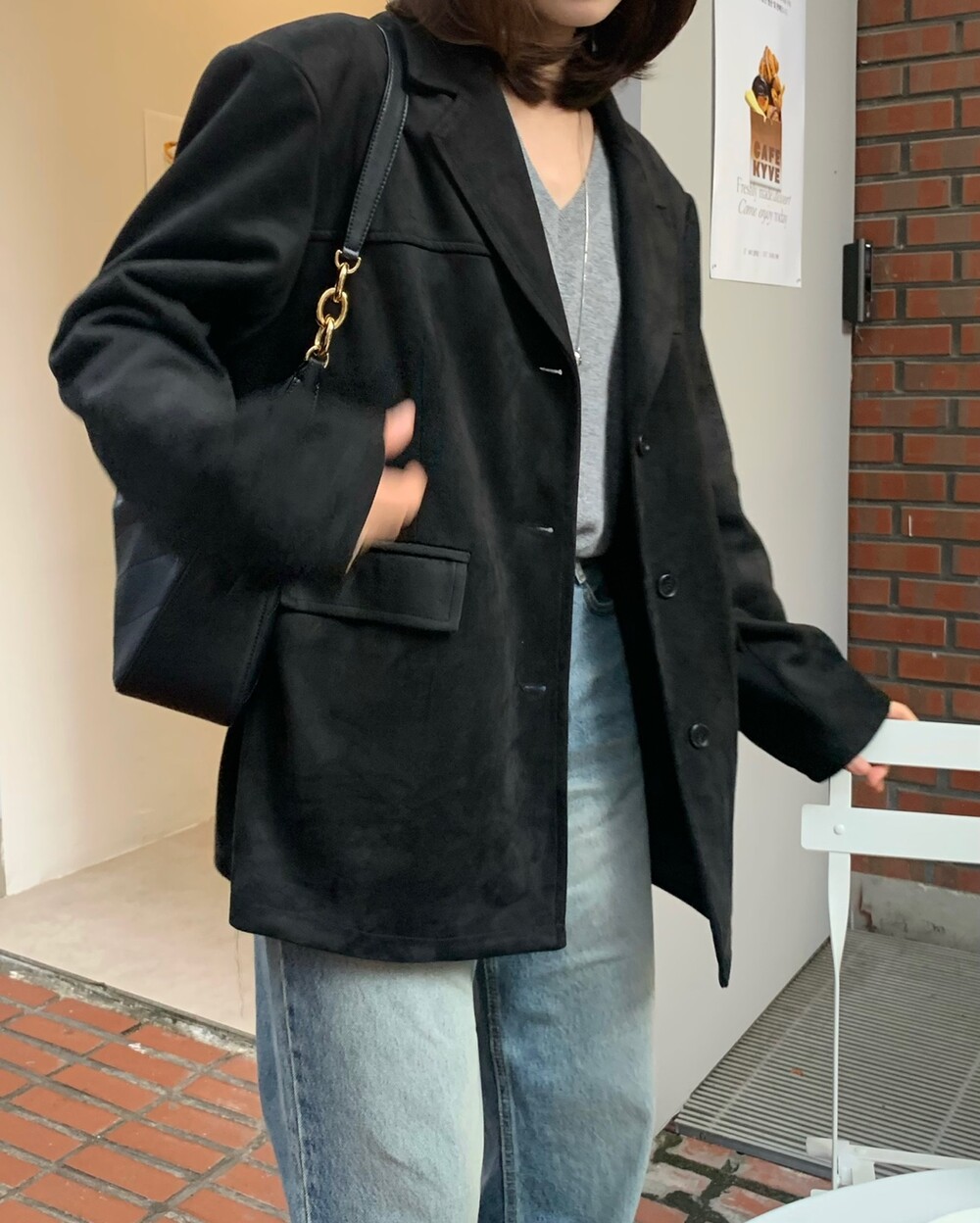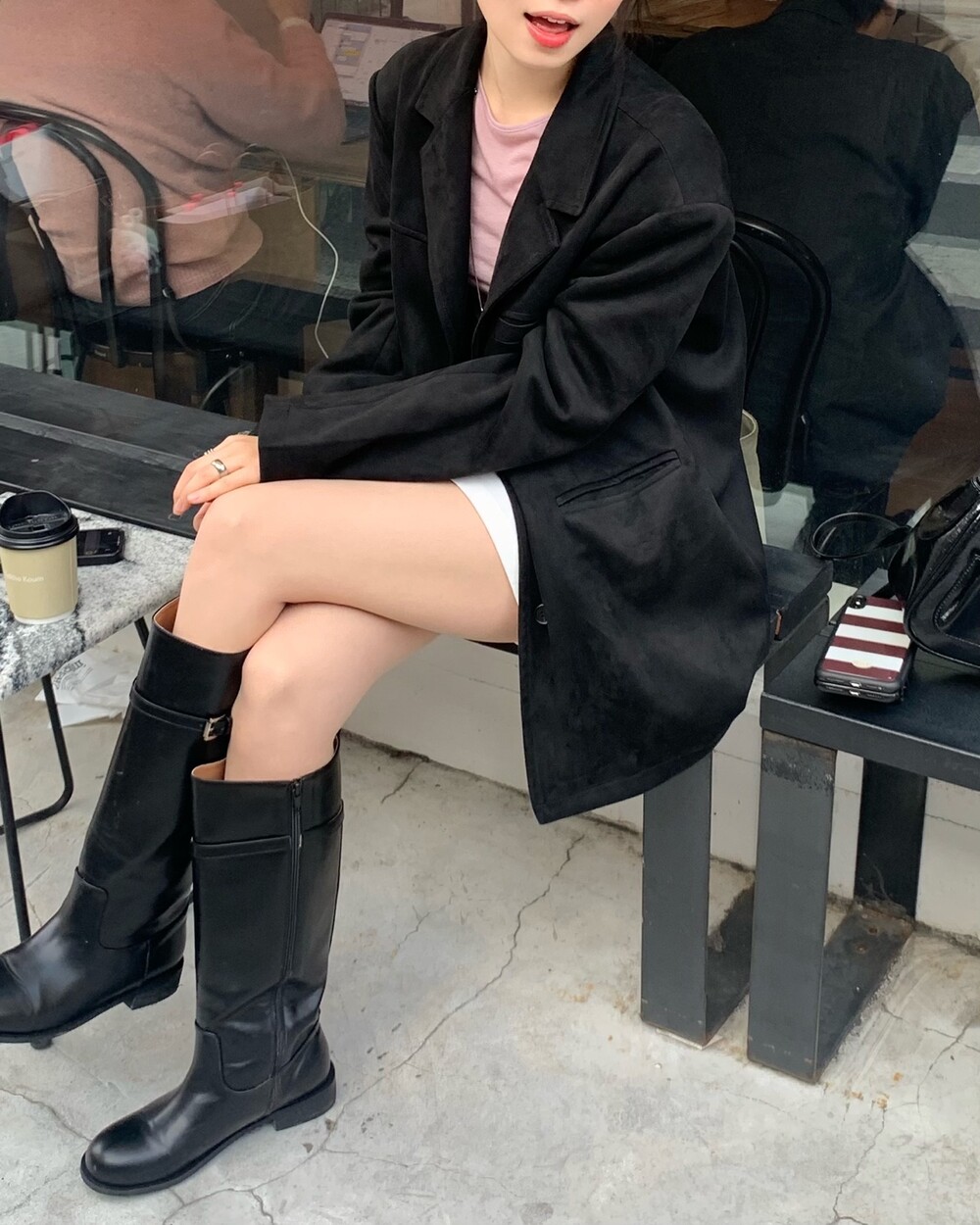 요즘 느낌 좋은 언니들이라면 하나쯤은 가지고 있는 아이템인데요 ㅎㅎ 스웨이드 자켓을 구매할 때 가장 따져보고 구매하셔야 할 제품이 바로 재질입니다! ☆혼용률이 아닌 정말 눈으로,손으로 느껴지는 텍스처요☆ 물론 실패 없는 구매를 위해서 제가 대신 꼼꼼히 따져서 셀렉해 온 제품이기도 한데요ㅎㅎ 재질이 자칫 빳빳하거나, 인위적인 광이 도는게 눈에 보이는 순간! 싼티 나 보이는 자켓 되기 쉽상이거든요? 그만큼 스웨이드 제품은 원단이 가장 중요하답니다! 이 제품은 광택감이 돌지 않고 손끝으로도 느껴지는 부드럽고 유연한 감촉이 정말 장점이에요. 매끄러운 원단 덕분에 착용했을 때 몸에 자연스럽게 흐르는 핏이 두배로 멋스러운 분위기를 이끌어내주더라구요 ♡